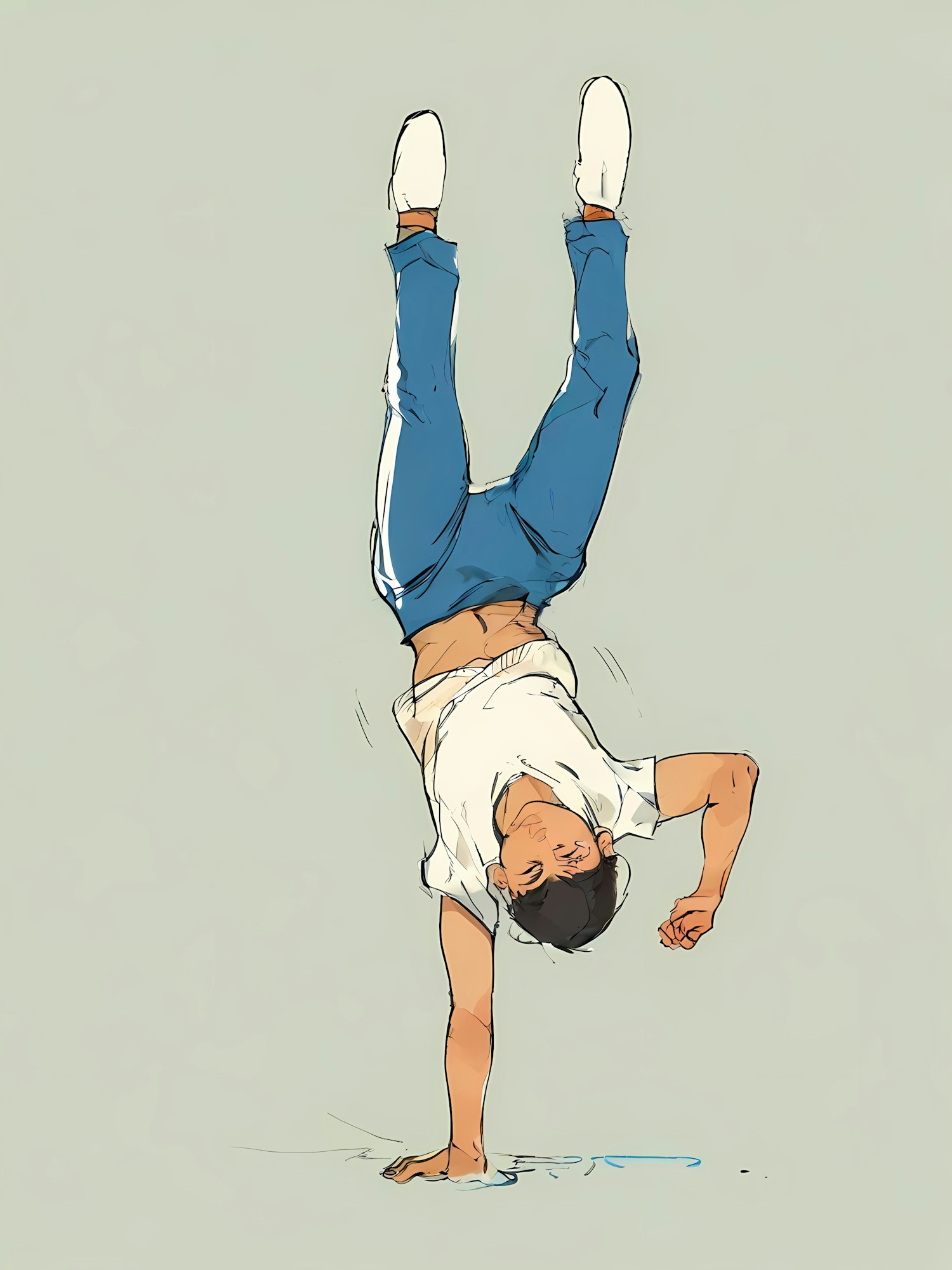 Illustration of a person doing a one-handed handstand, wearing a white t-shirt and blue pants, showcasing balance and strength.