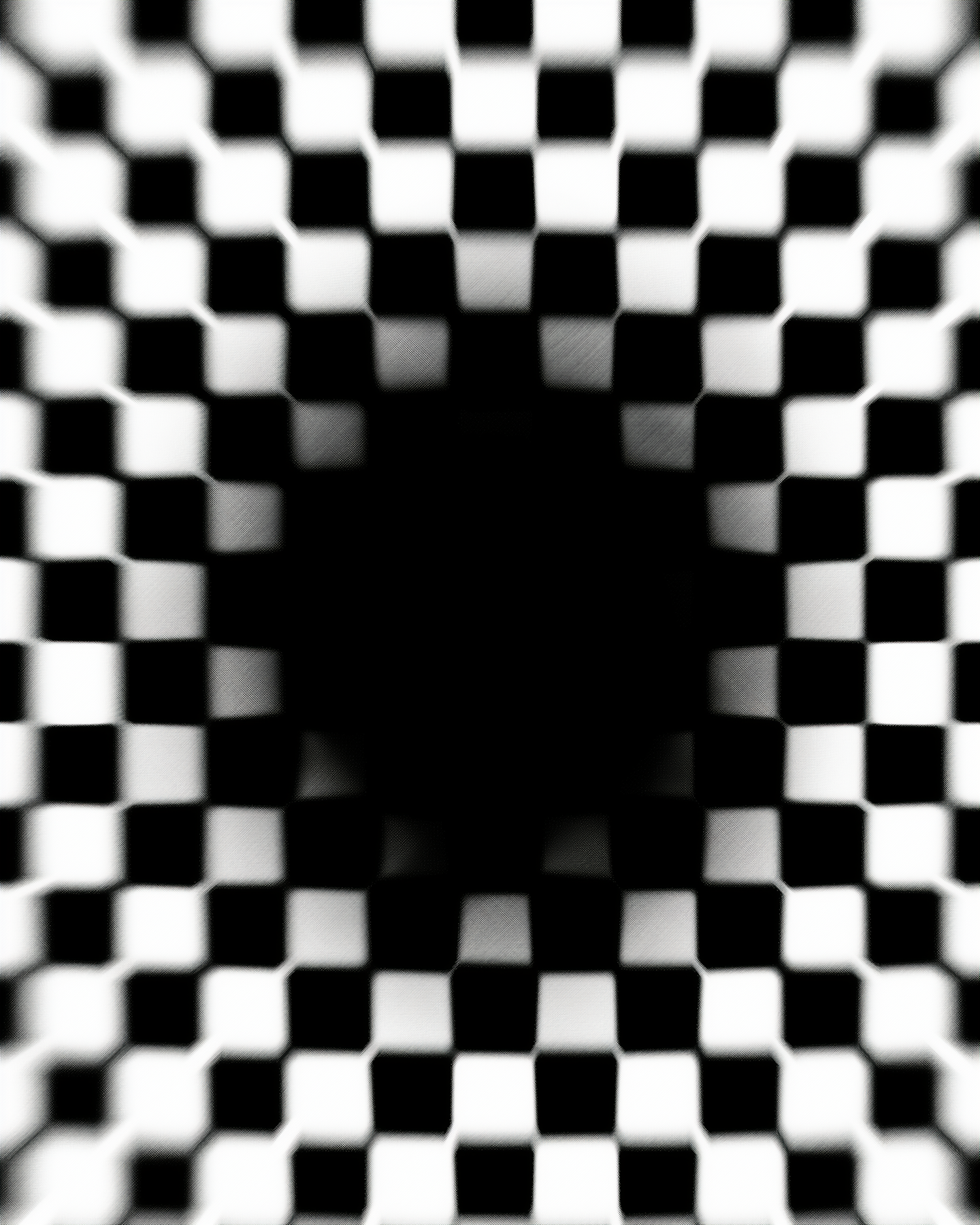 Optical illusion with a warped black and white checkerboard pattern creating a tunnel effect.