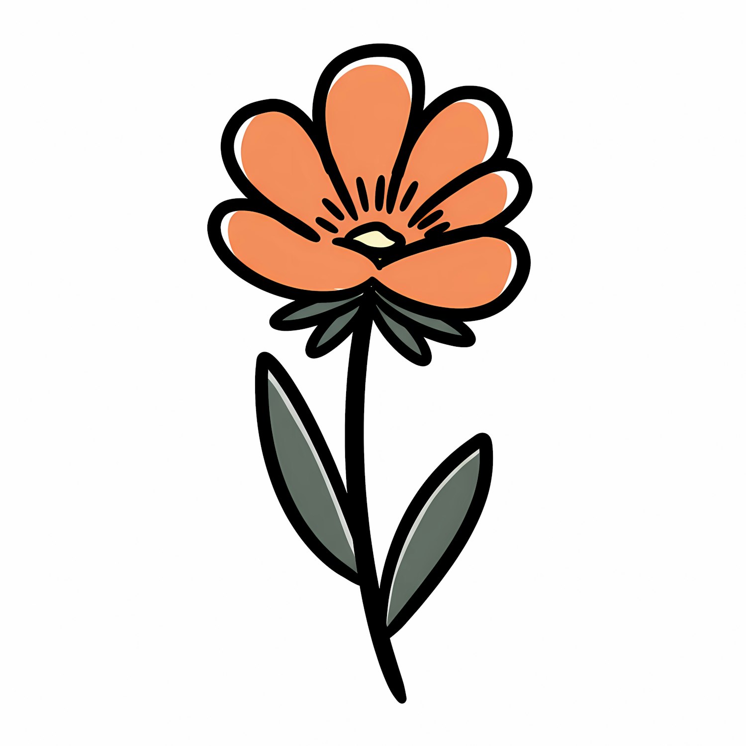 A simple and bold illustration of an orange flower with green leaves on a white background, perfect for decorative or design purposes.