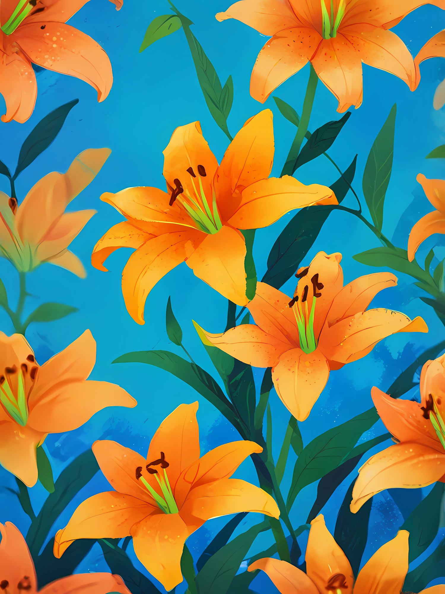 Bright orange lilies in full bloom with green leaves, set against a vivid blue background. A stunning floral illustration full of life.