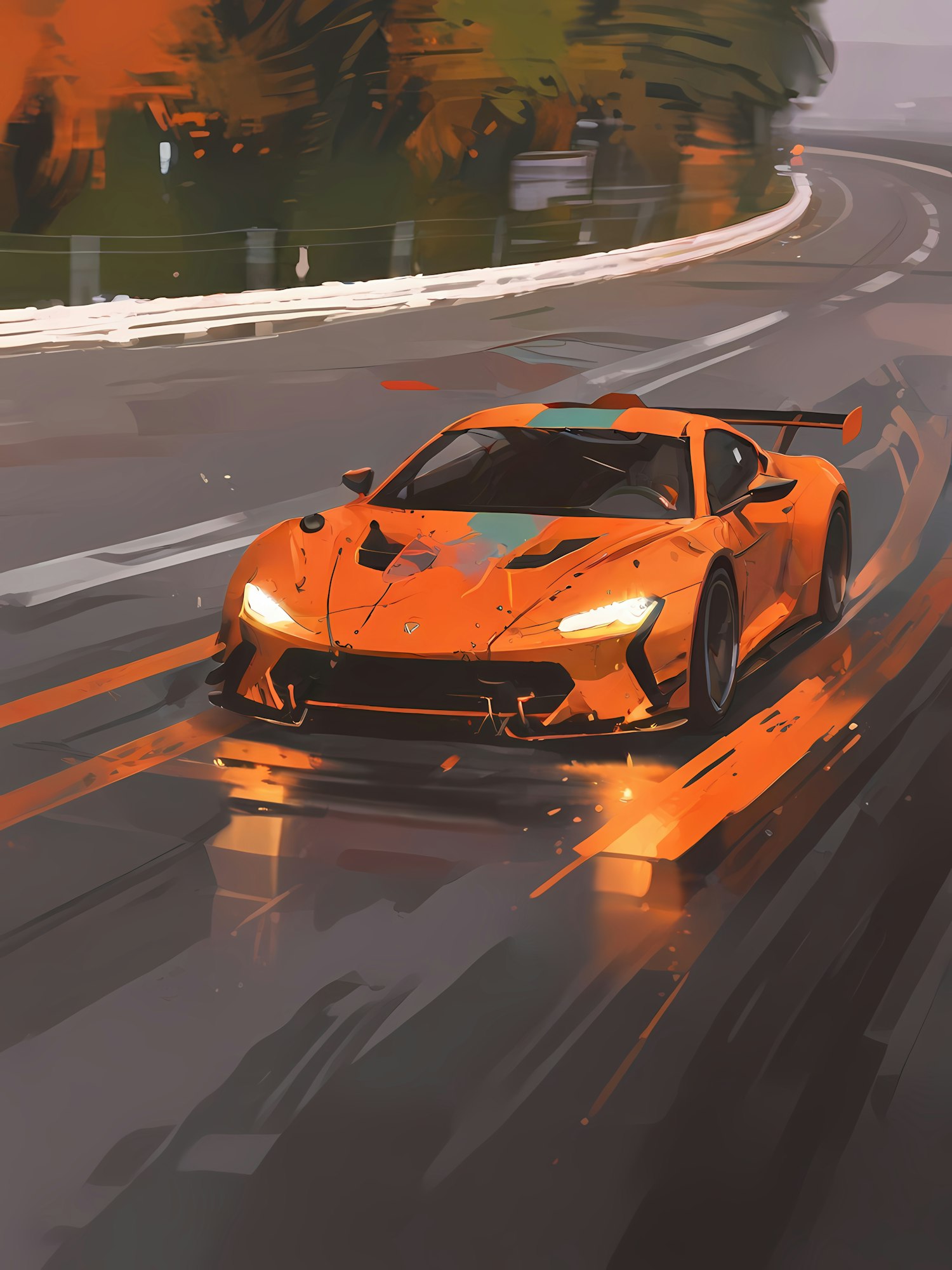 A vibrant orange sports car races on a wet track, reflecting its sleek design and speed. Blurred autumn trees enhance the dynamic scene.