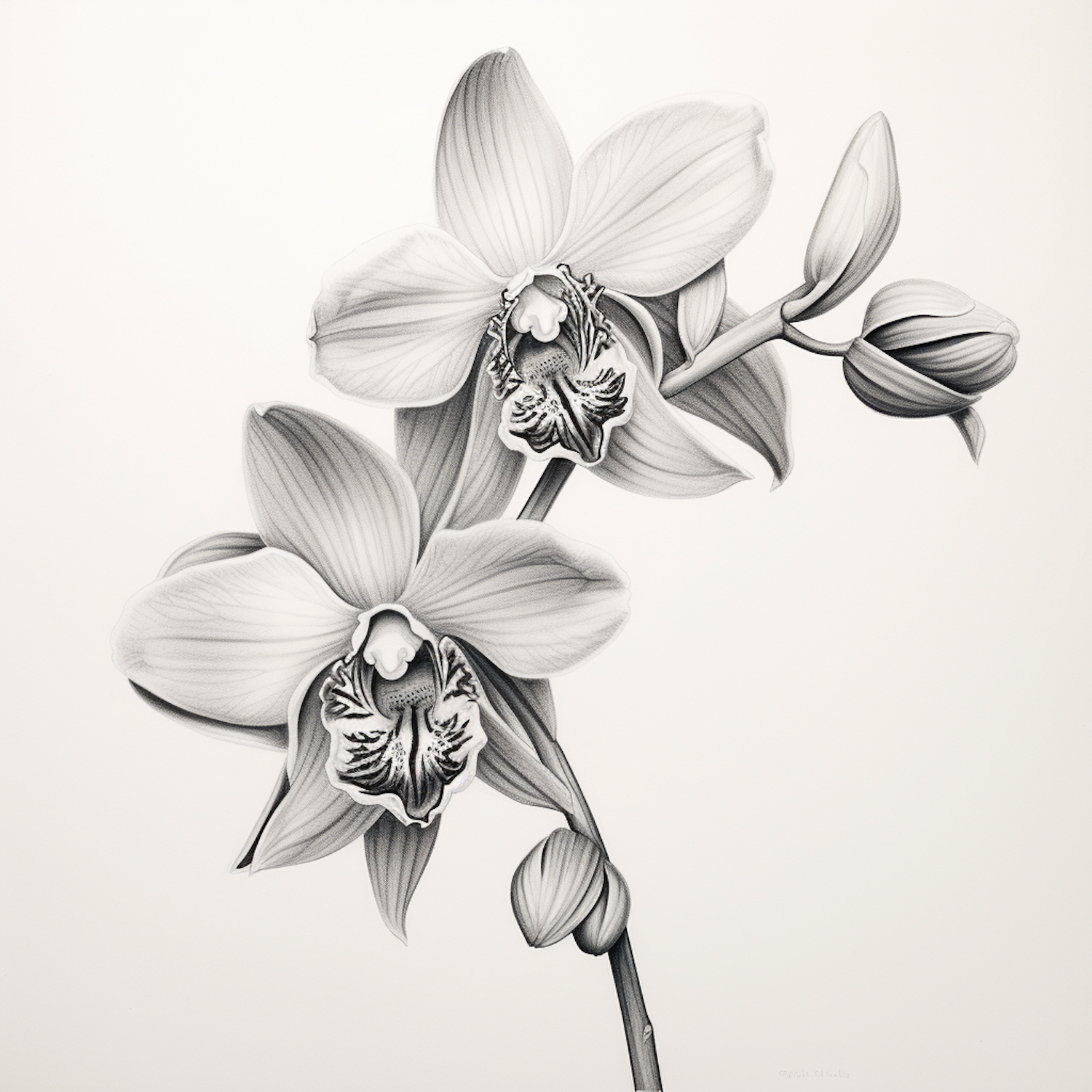 Intricate black and white illustration of orchids with detailed petals and buds on a slender stem.