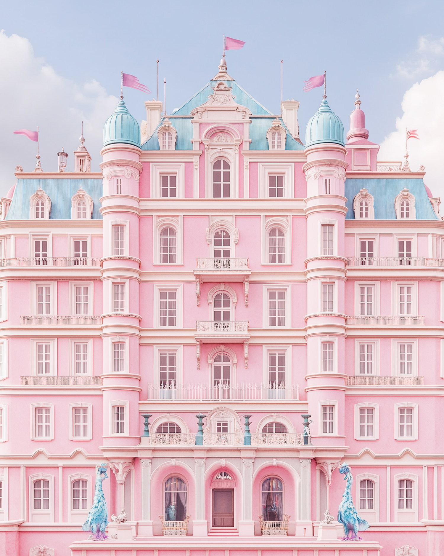 Whimsical pink building with blue roof, ornate details, and peacock sculptures. A fairy-tale architectural masterpiece.
