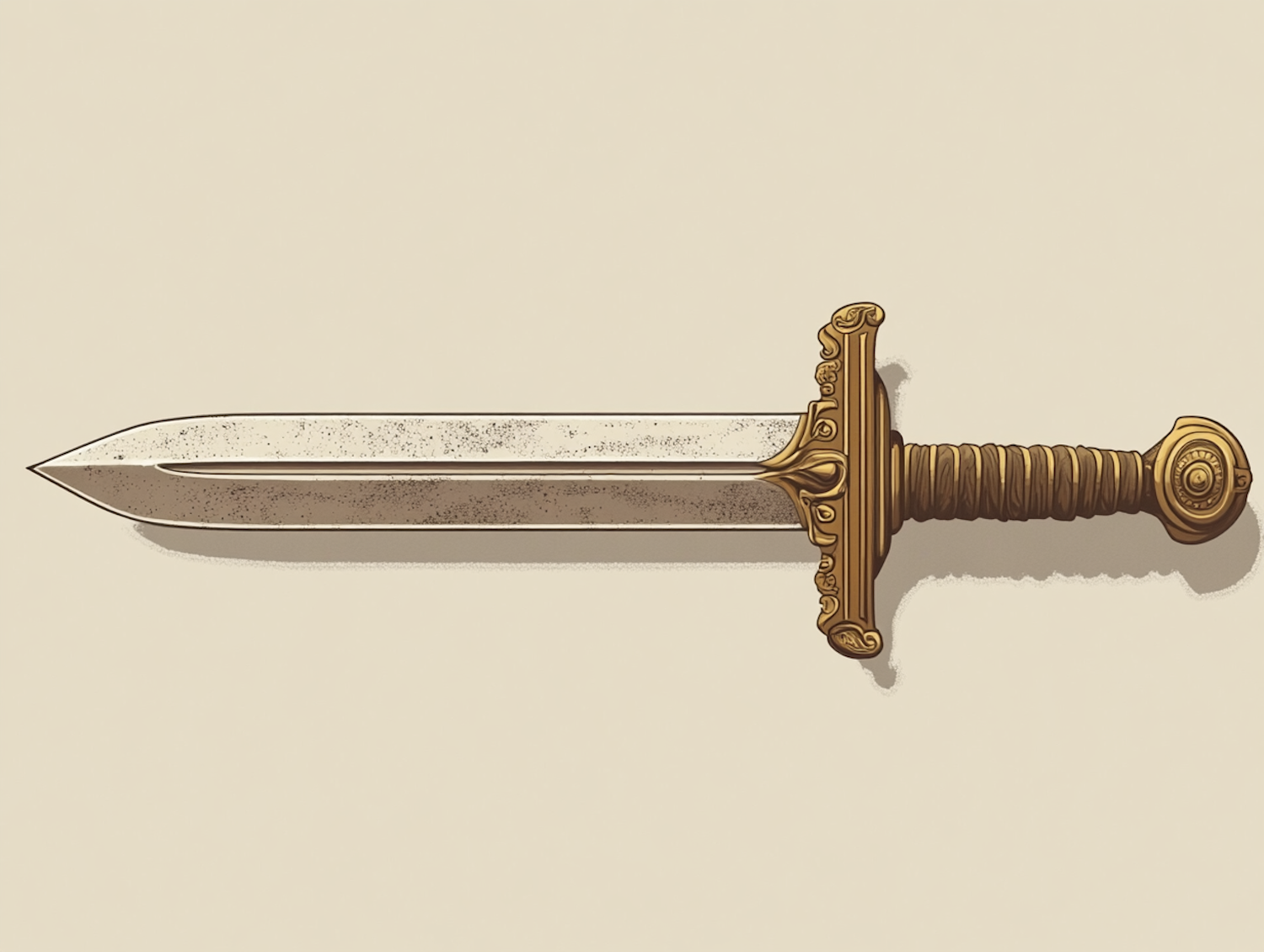 Illustration of a classic sword with a golden hilt and ornate design on a light beige background.