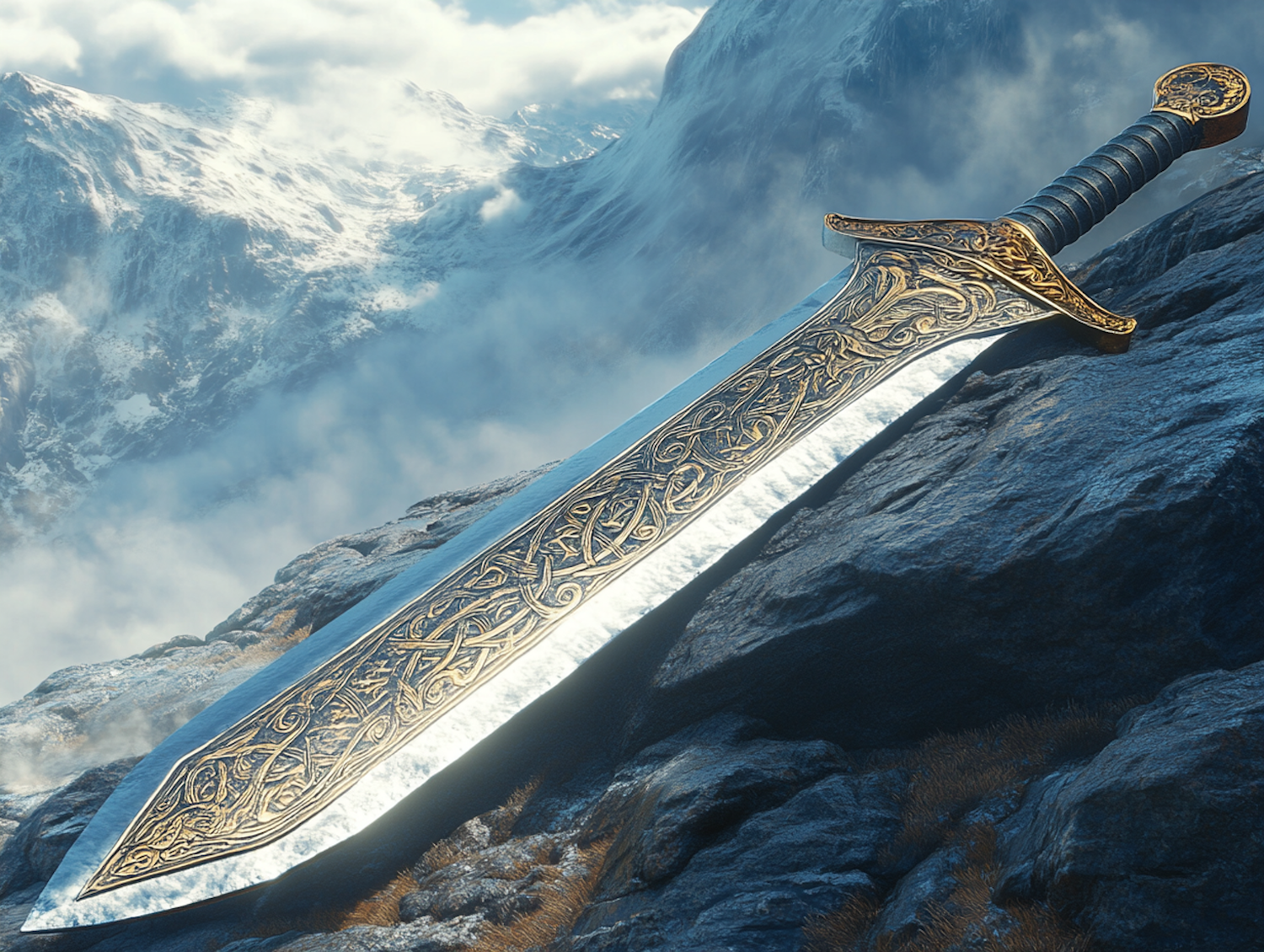 Ornate golden sword with intricate engravings resting on rocks in a misty mountain setting, exuding mystique and grandeur.