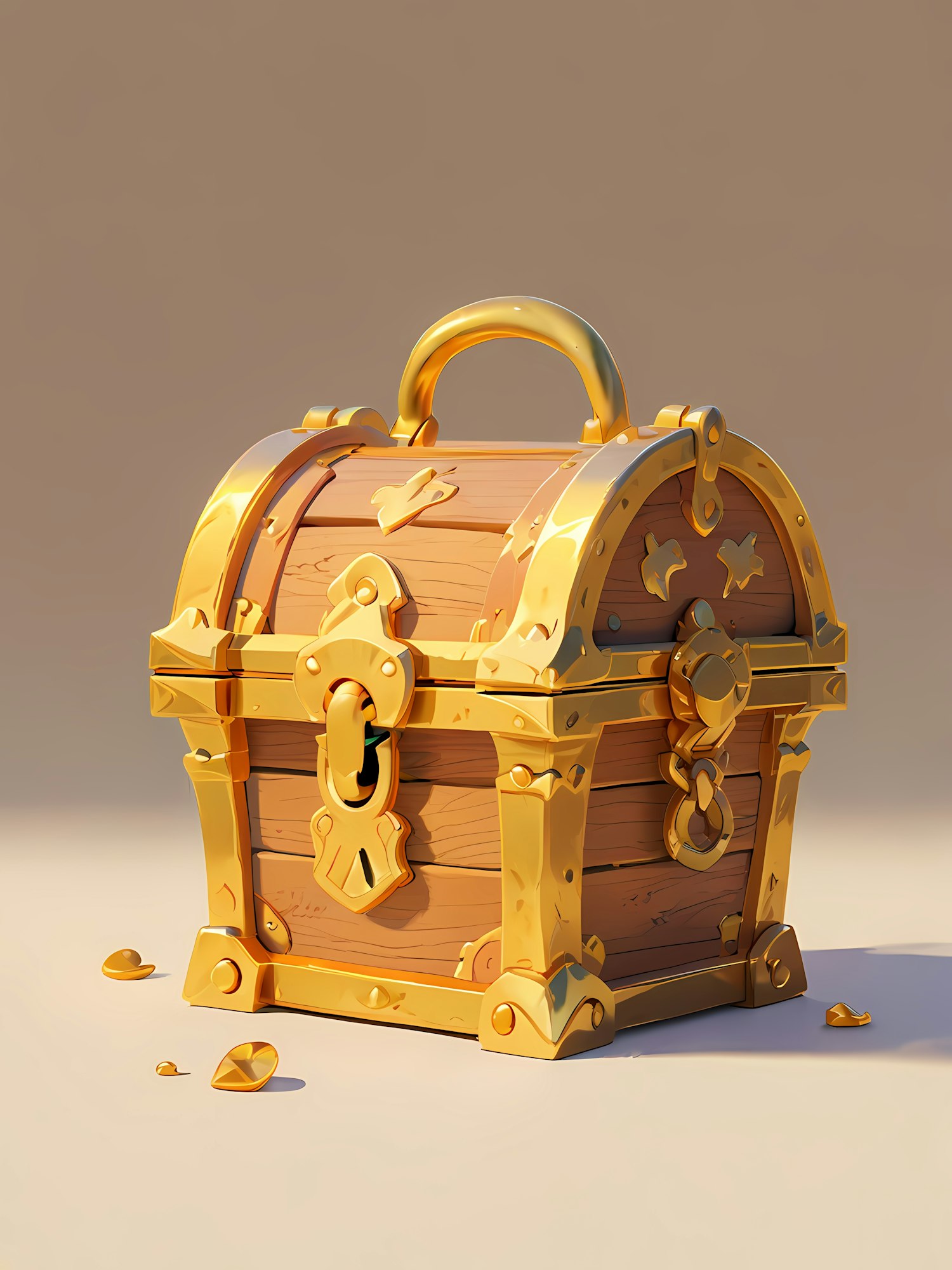 Stylized treasure chest with golden accents, scattered coins, and gems on a beige surface. Perfect for fantasy or adventure themes.