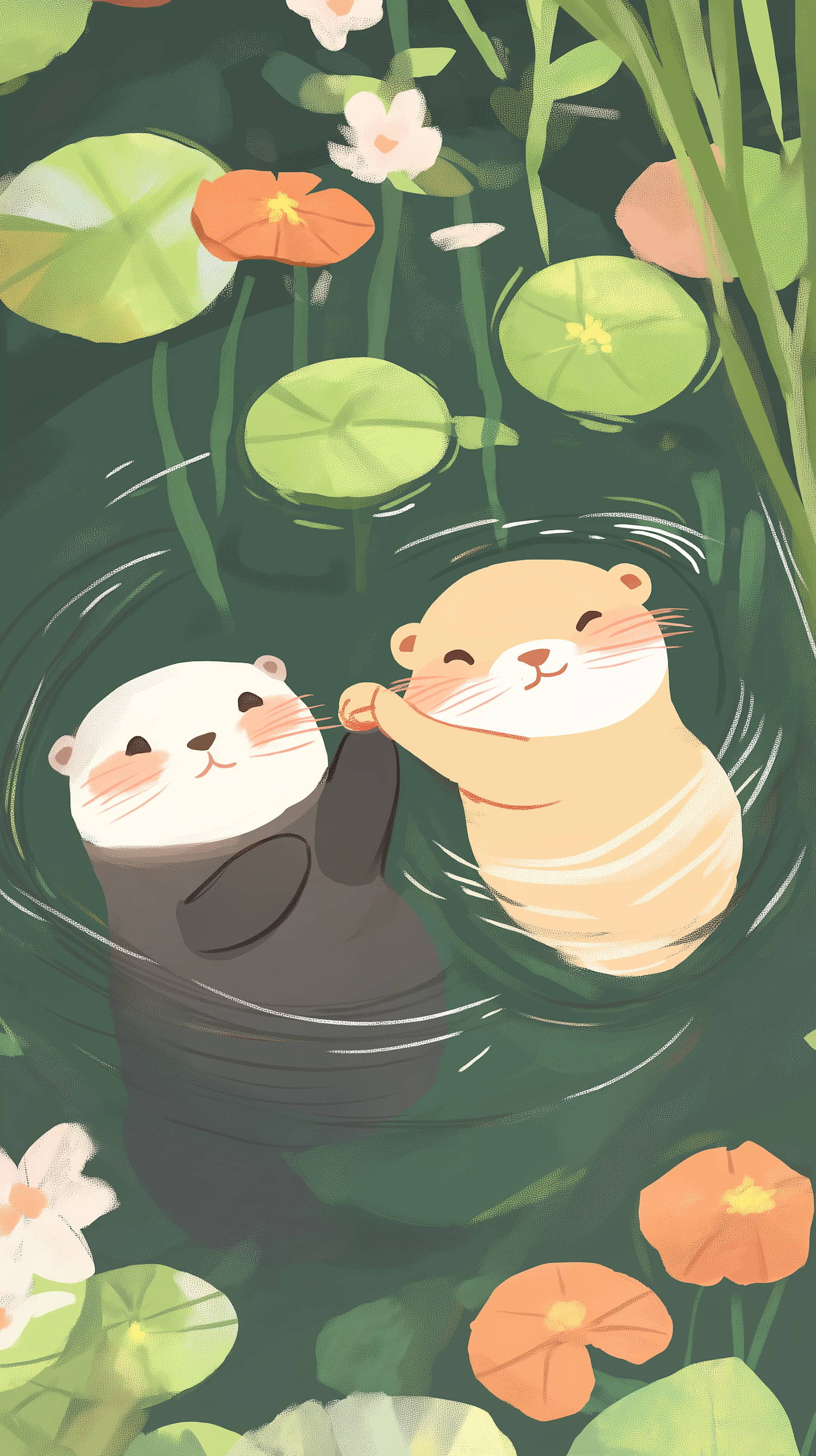 Two cute otters holding hands in a pond surrounded by lily pads and flowers, creating a serene and joyful scene.