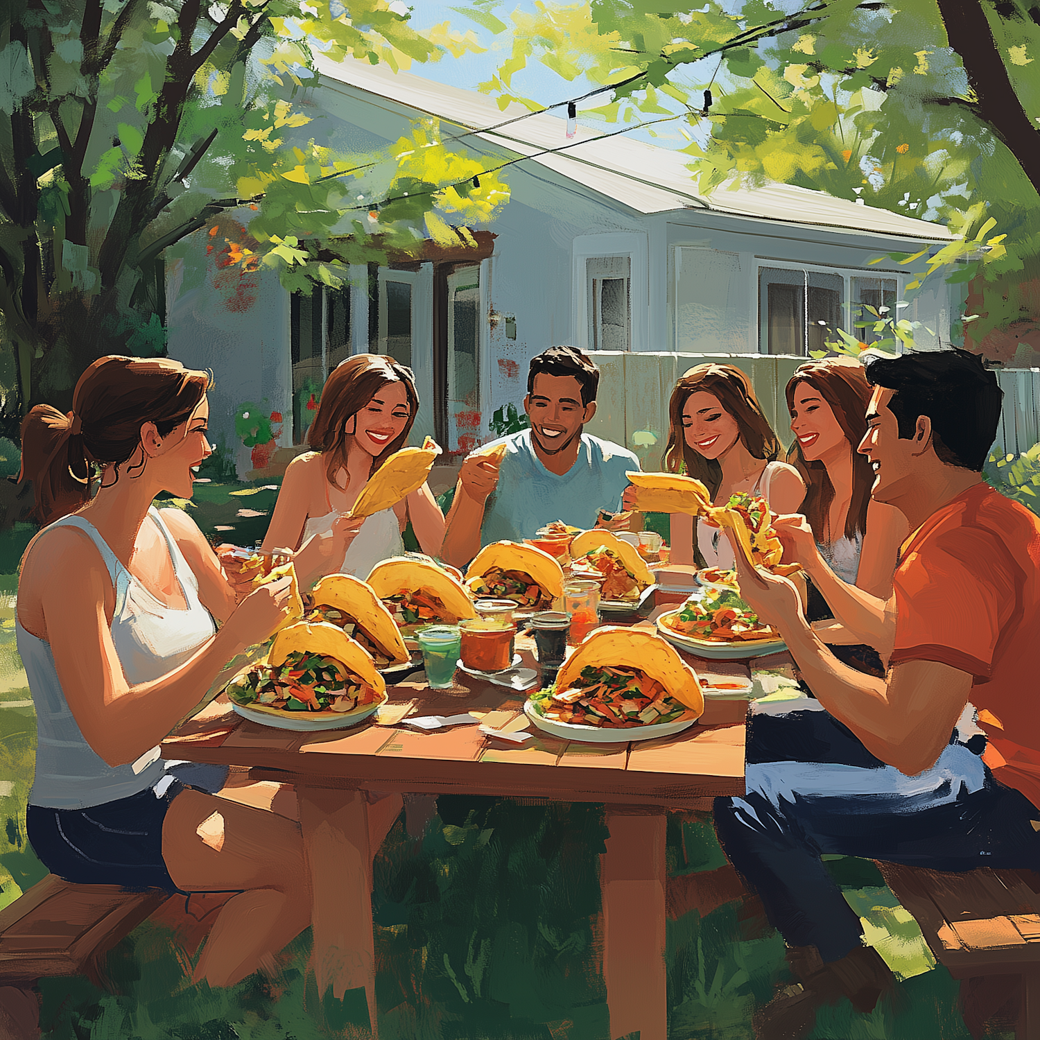 Friends enjoy a sunny backyard taco feast, sharing laughter and vibrant flavors under string lights.