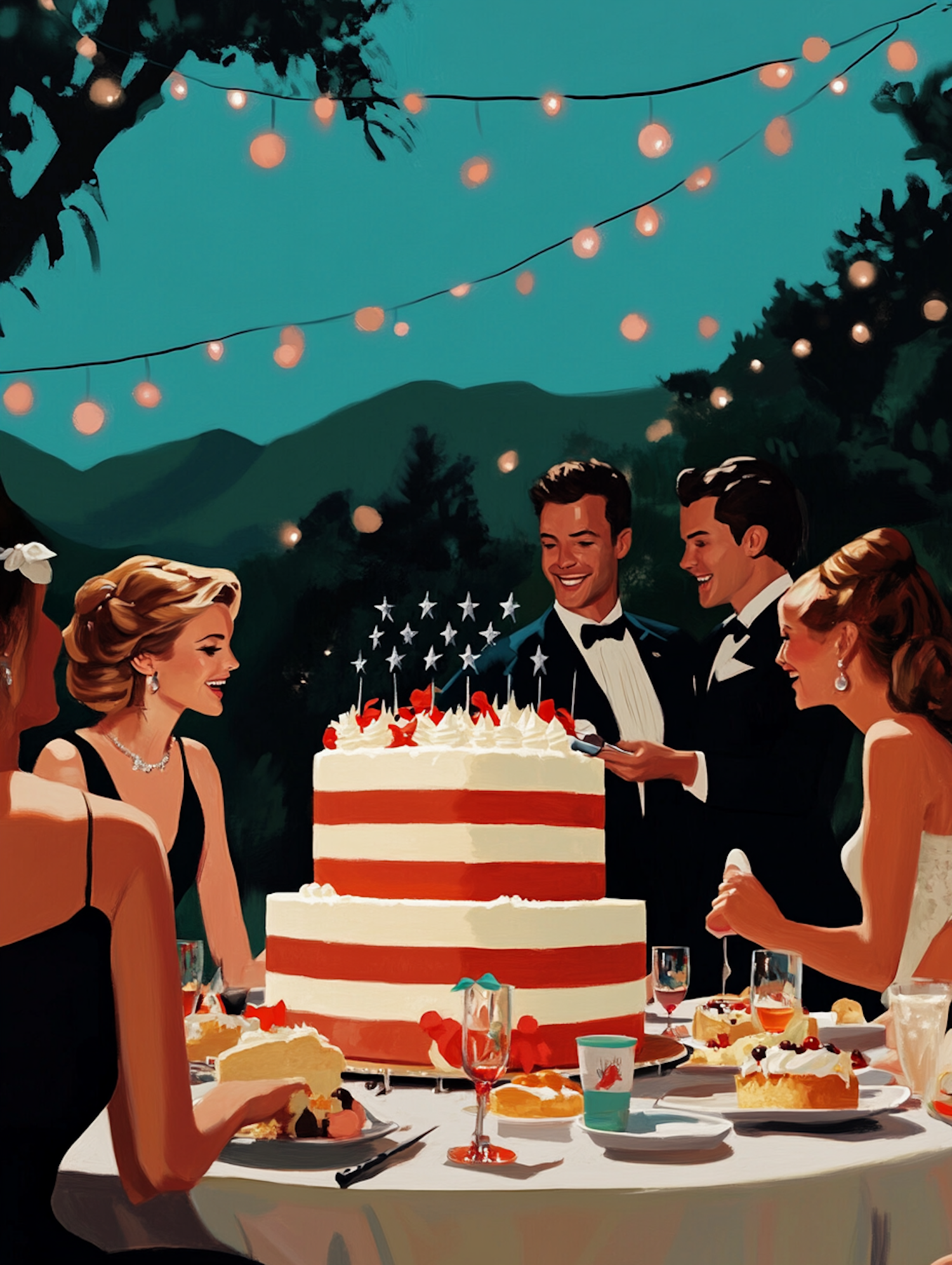 Elegant outdoor celebration with a patriotic-themed cake, string lights, and formally dressed guests in a serene mountain setting.
