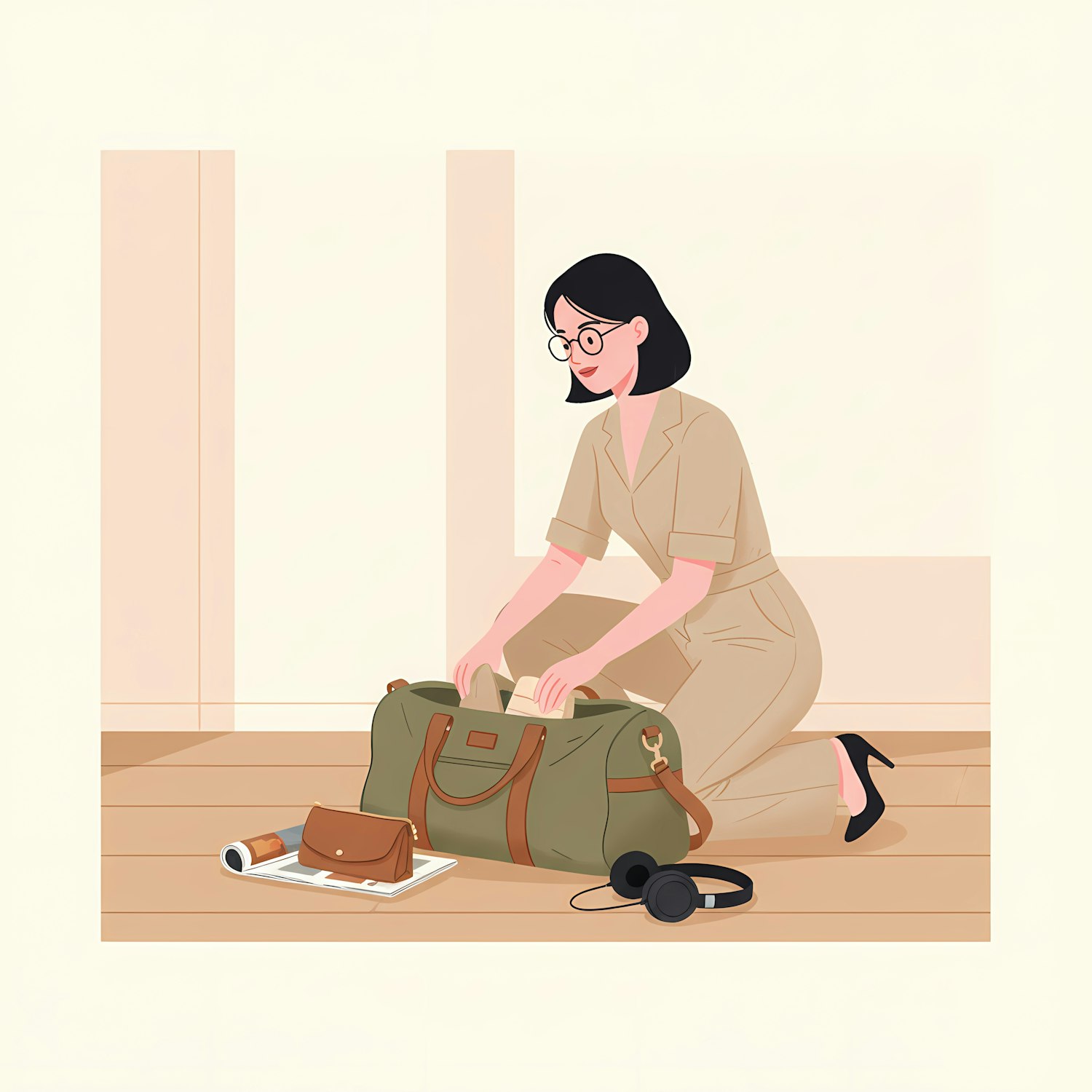 Illustration of a woman packing a green duffel bag, surrounded by travel essentials like a purse, magazine, and headphones.