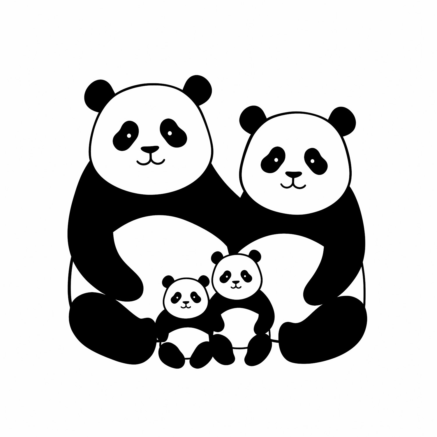 Adorable cartoon illustration of a panda family with two adults and two babies, perfect for children's designs or animal-themed projects.
