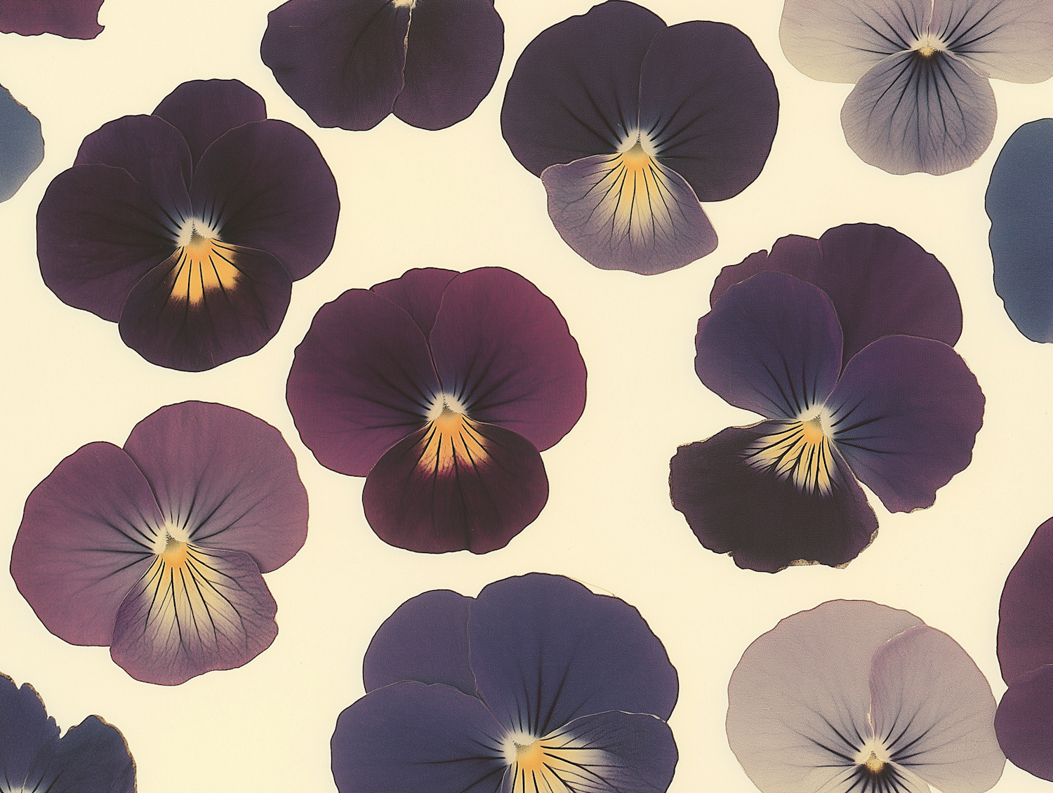 Elegant pansy flowers in rich purples and blues on a cream background, showcasing their vibrant colors and delicate details.