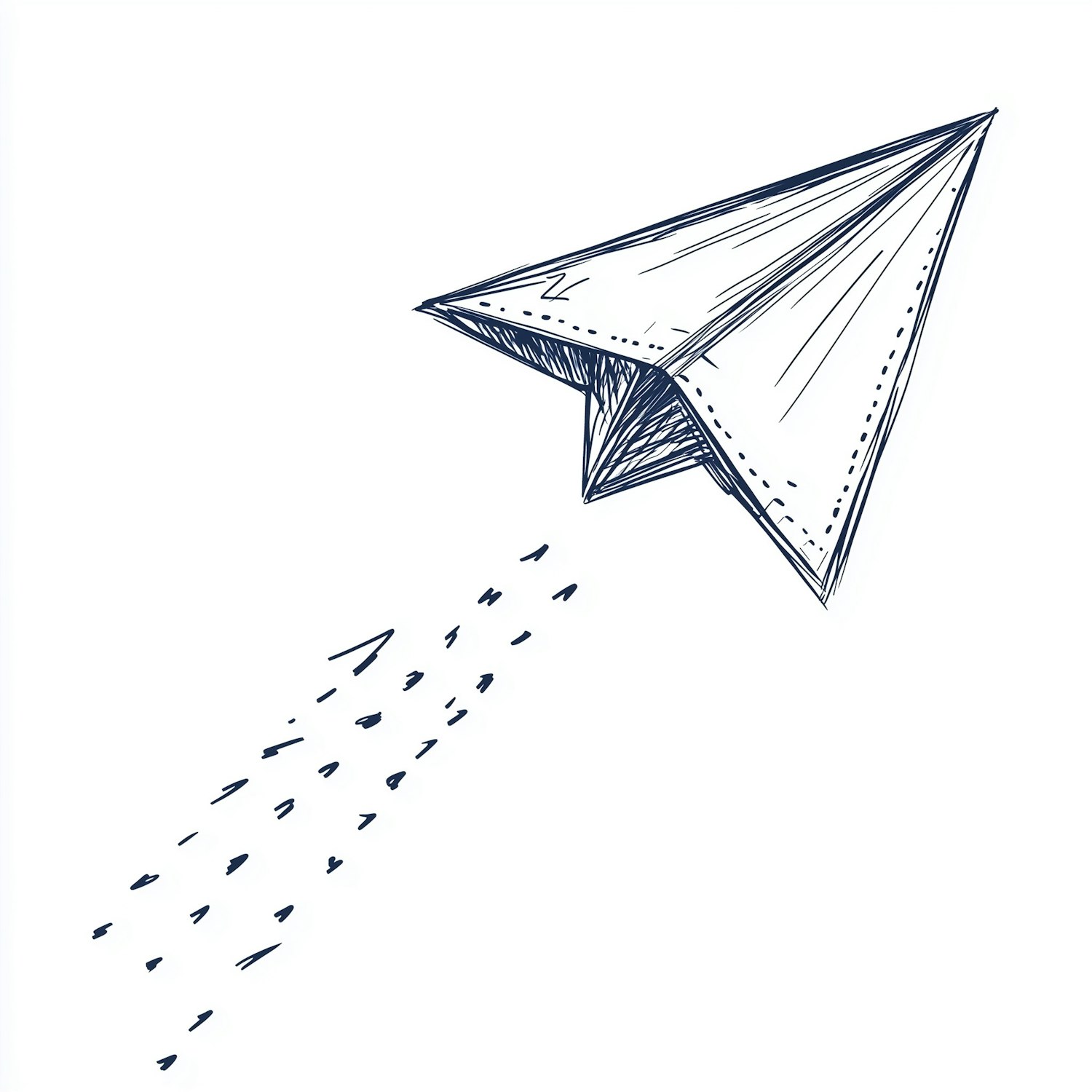 Hand-drawn sketch of a paper airplane in flight with motion lines on a white background, symbolizing creativity and simplicity.