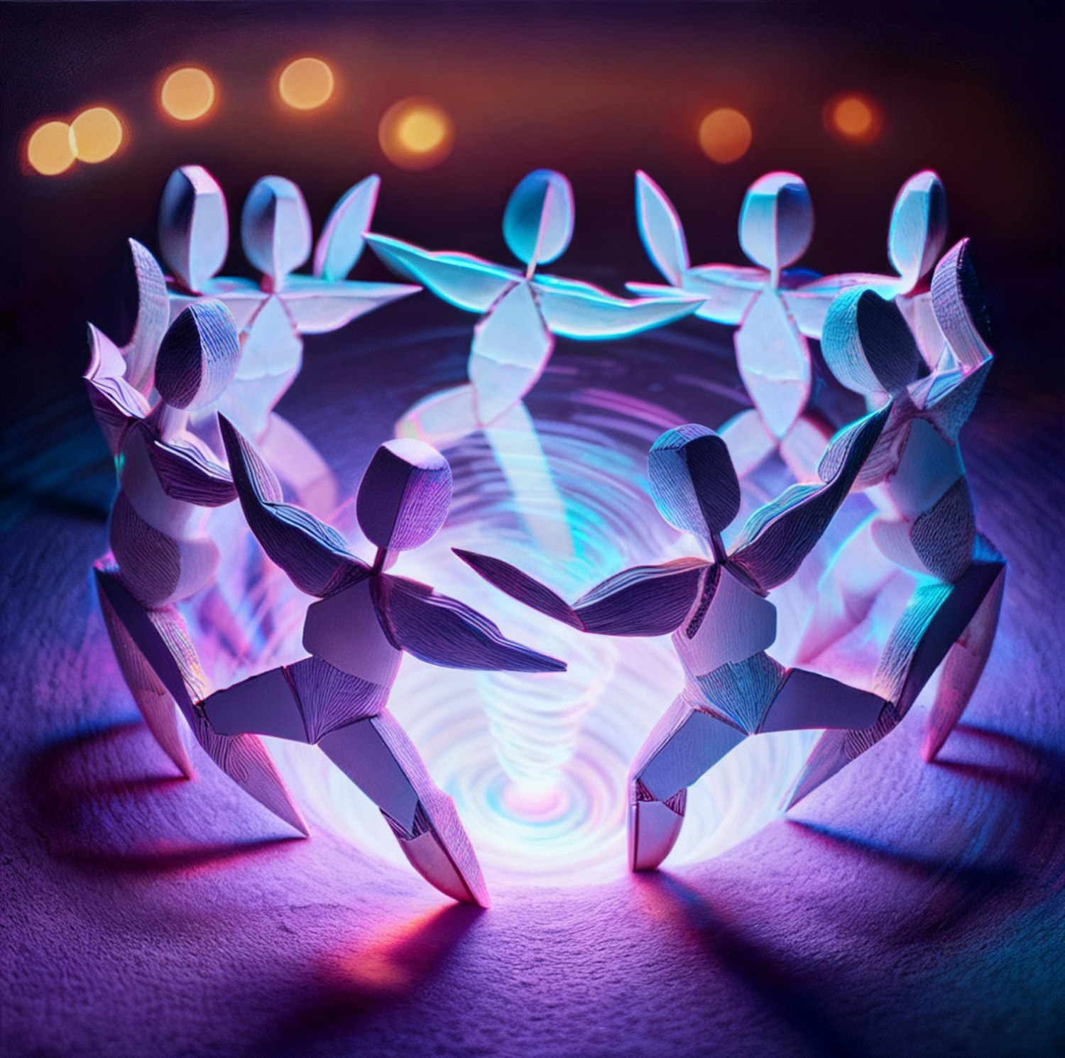 A circle of paper figures illuminated by vibrant purple and blue lights, with a glowing spiral at the center and warm bokeh in the background.