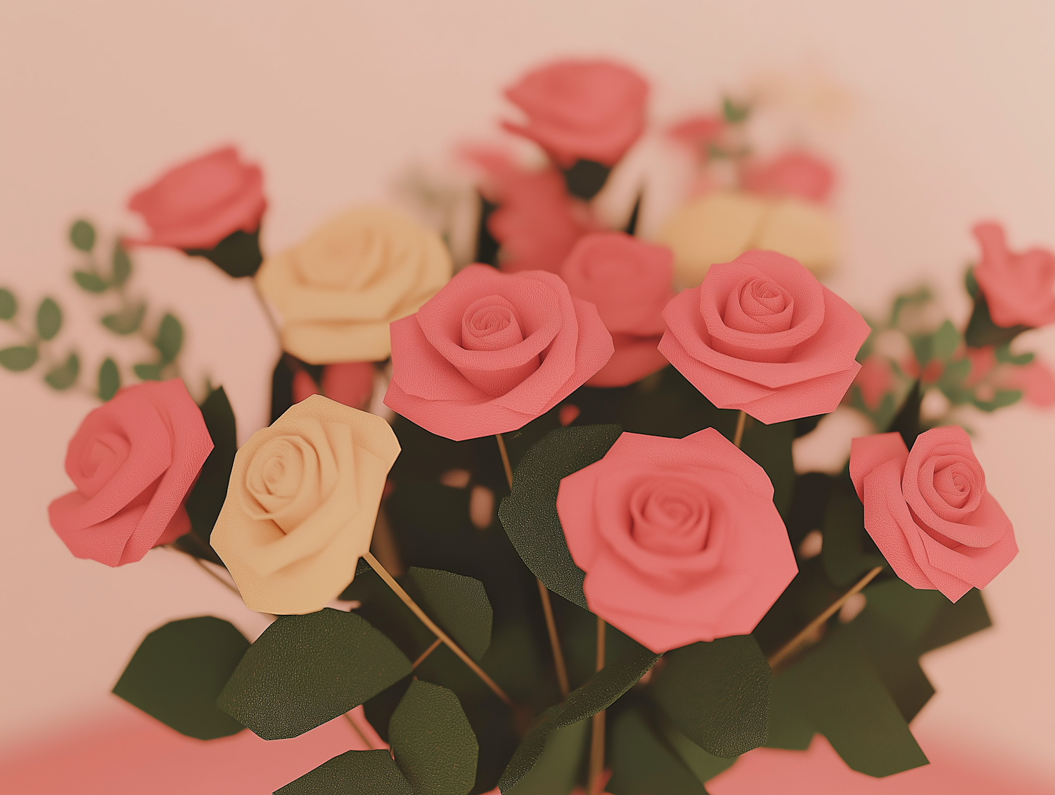 Elegant paper roses in pink and cream hues, arranged in a delicate bouquet with green leaves against a soft pink background.