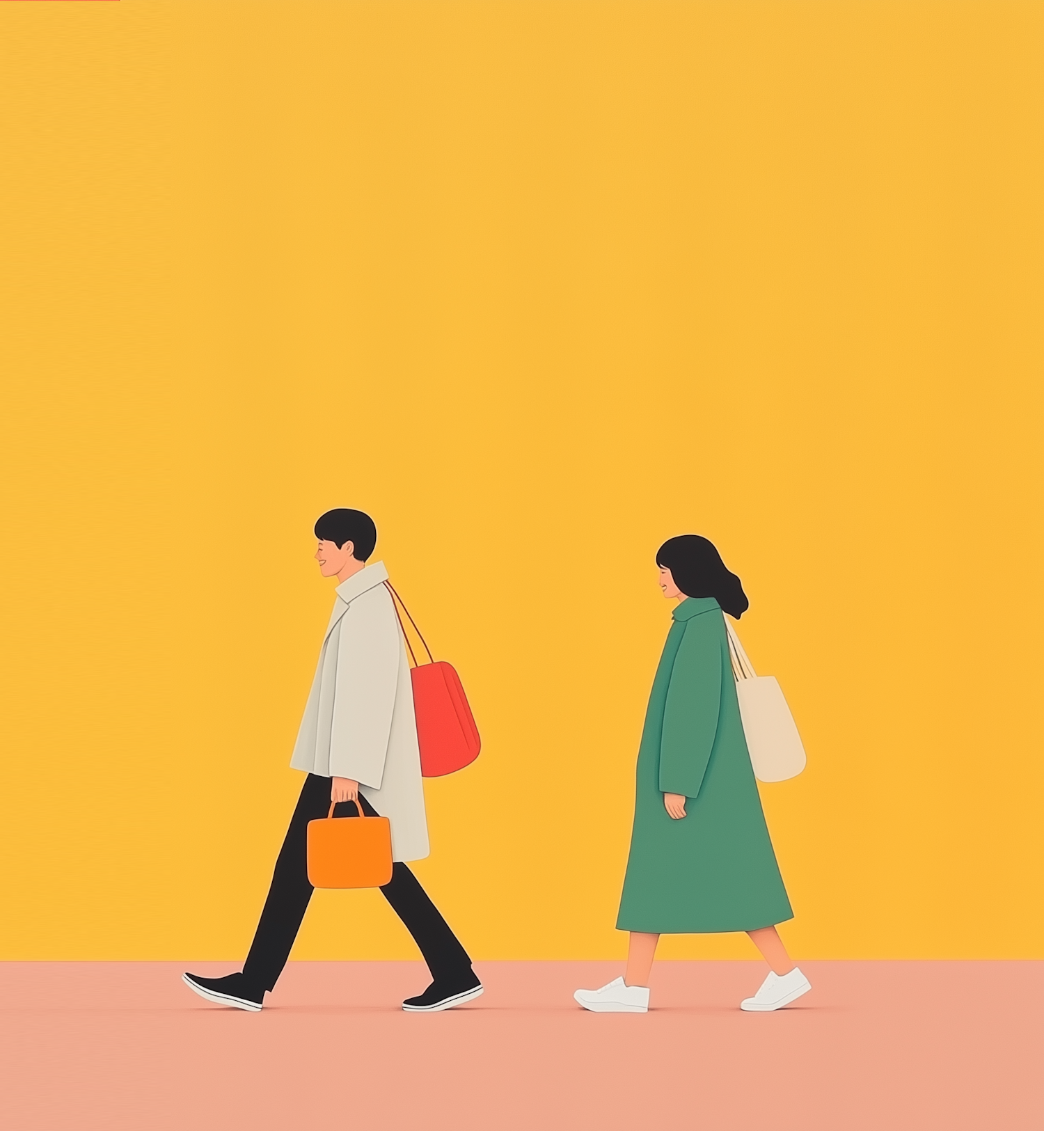 Minimalist illustration of two figures walking with colorful bags against a vibrant yellow background.