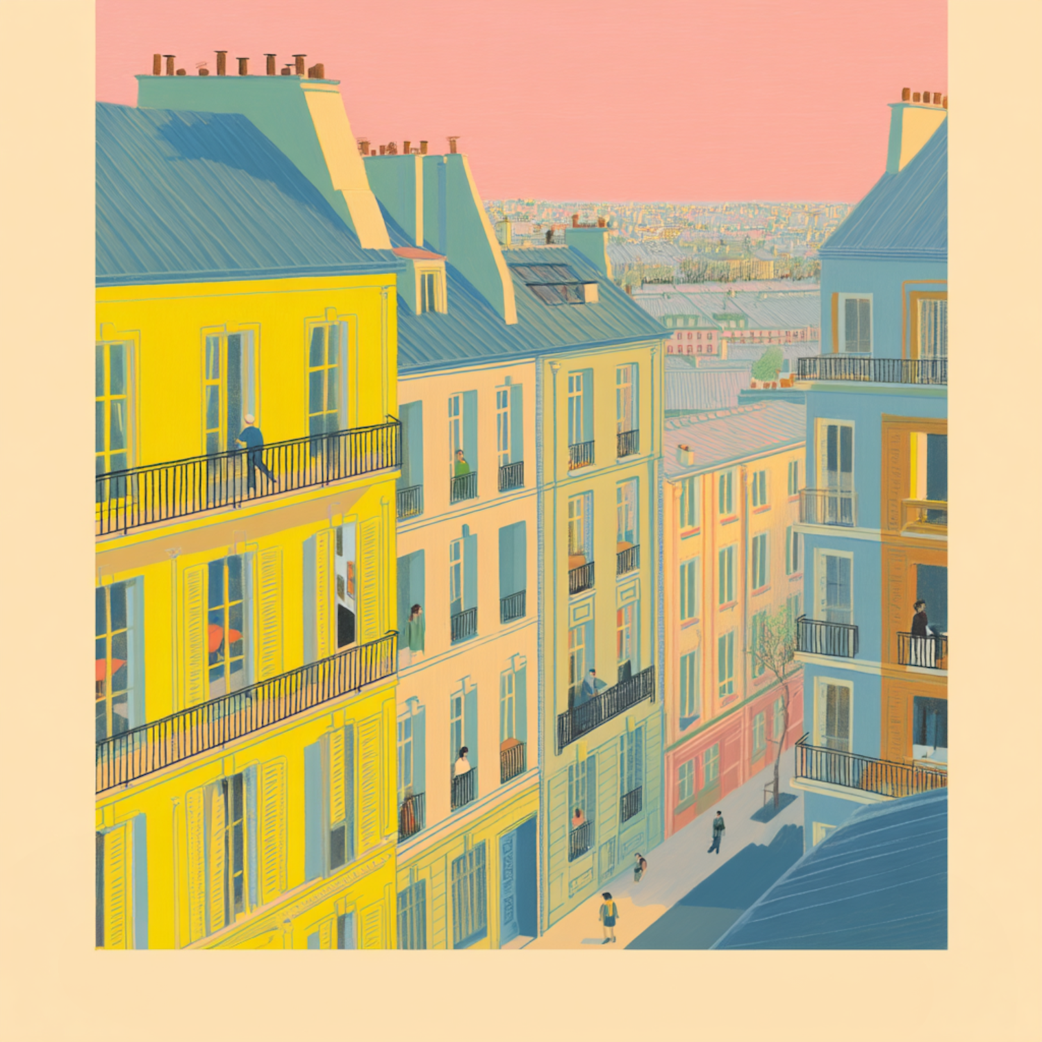 Charming Parisian street illustration with pastel buildings, intricate balconies, and a warm pink sunset sky. A lively urban scene.