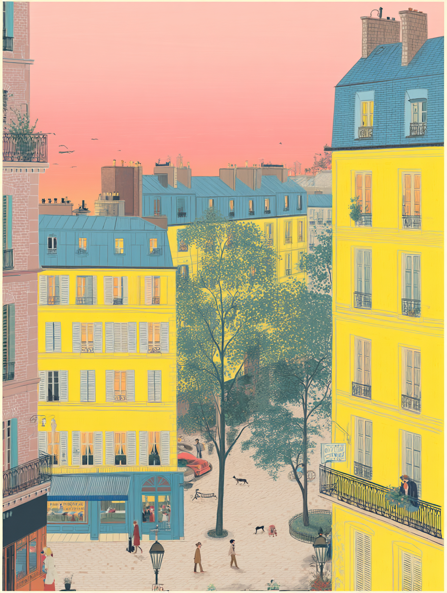 Charming Parisian street scene at sunset with yellow buildings, blue rooftops, lush trees, and people enjoying a serene evening.