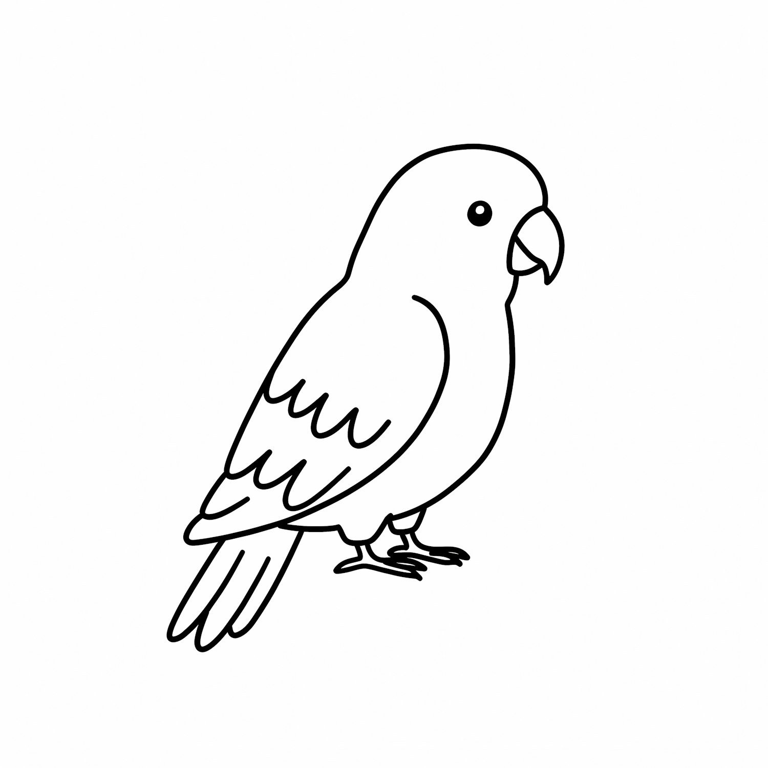 A clean black-and-white line drawing of a parrot, showcasing its side profile with simple and smooth outlines on a white background.