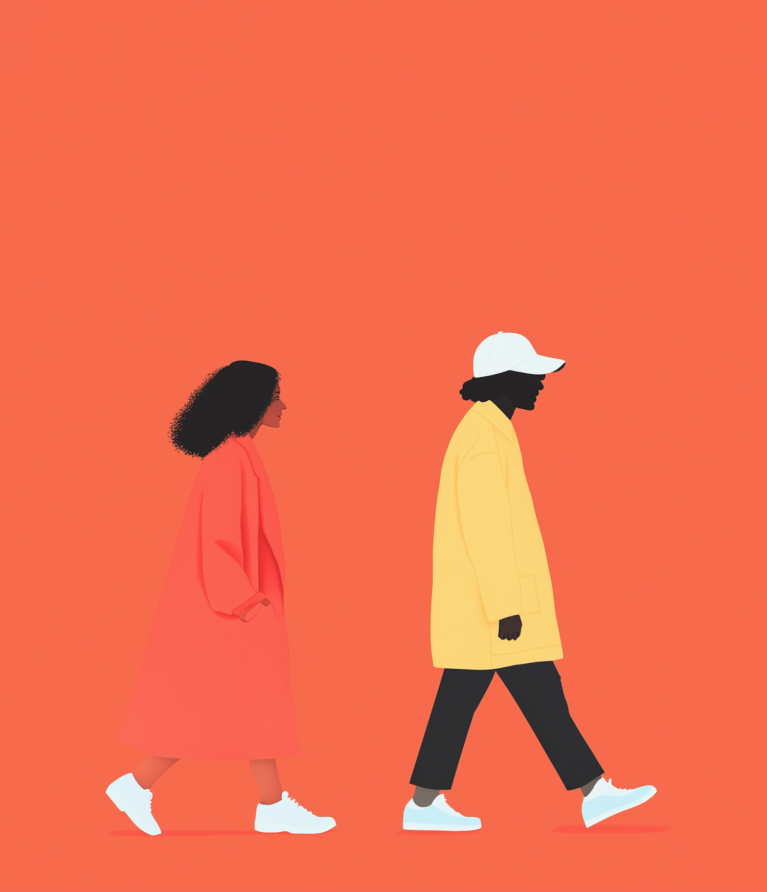 Minimalist illustration of two figures walking in colorful coats against an orange background, showcasing bold colors and clean lines.