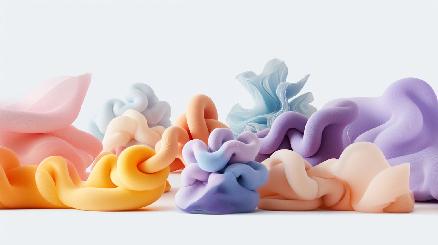 Abstract pastel shapes resembling soft fabric or clouds in a harmonious composition, featuring pinks, blues, and purples.