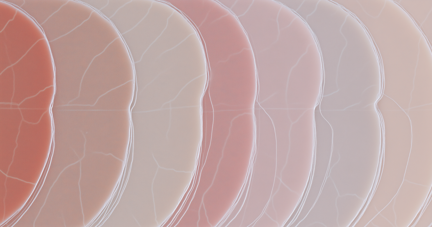 Abstract pastel ovals with vein-like patterns, transitioning from coral pink to beige. Minimalist design with glowing edges and soft textures.