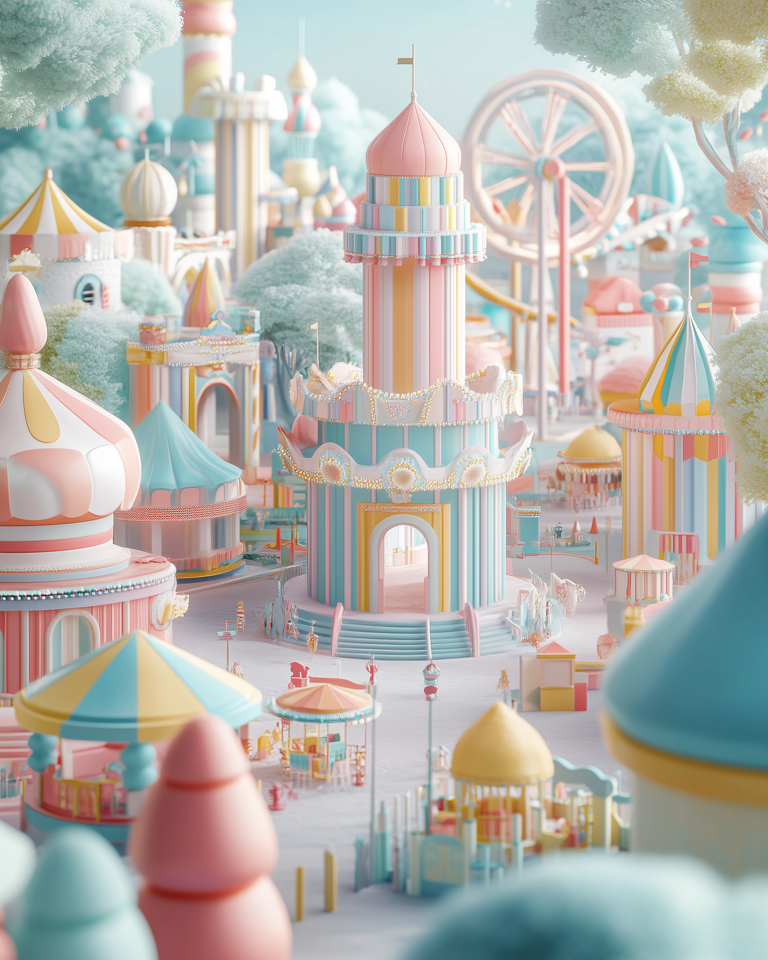 Dreamy pastel amusement park with a striped tower, Ferris wheel, and carousels. A whimsical fairytale vibe with soft, serene colors.