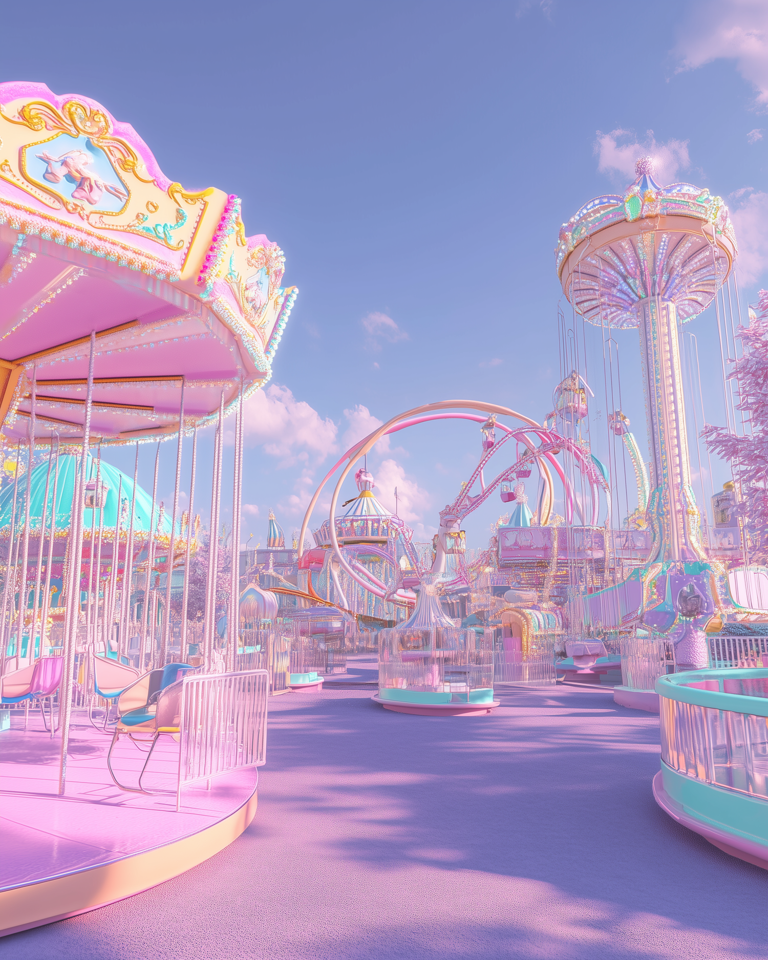 Dreamy pastel amusement park with glowing rides, a carousel, and a lavender sky. Perfect for whimsical and magical vibes.