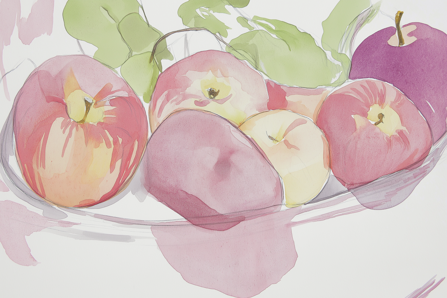 Watercolor illustration of a fruit bowl with apples in pink, red, and yellow hues, accented by green leaves.
