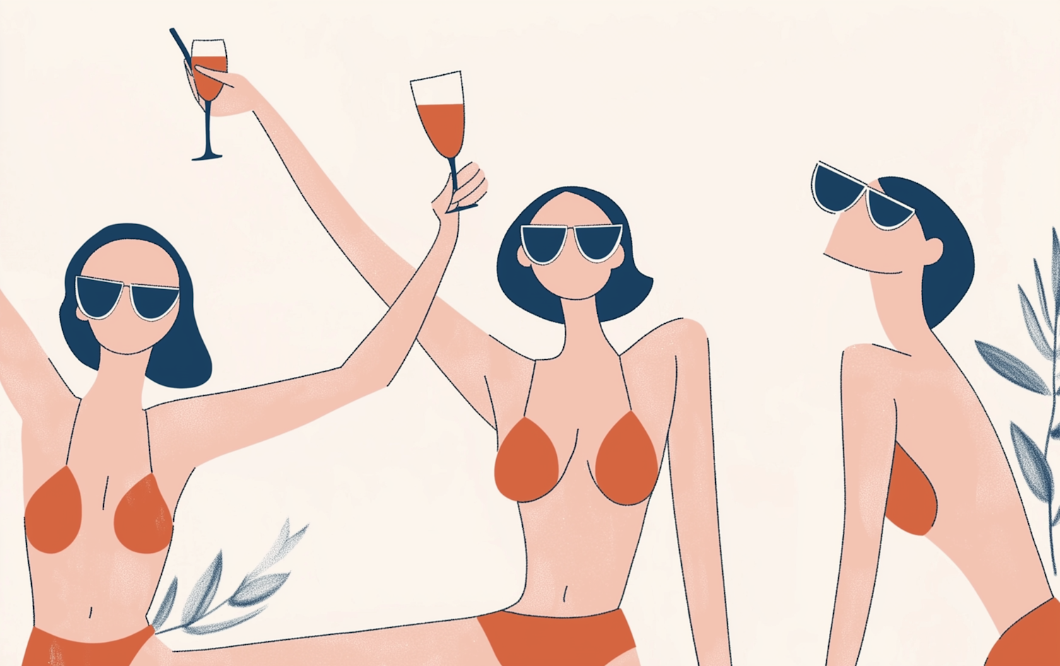 Minimalist illustration of three women in bikinis and sunglasses, holding wine glasses. Celebratory and summery vibe with leaf motifs.