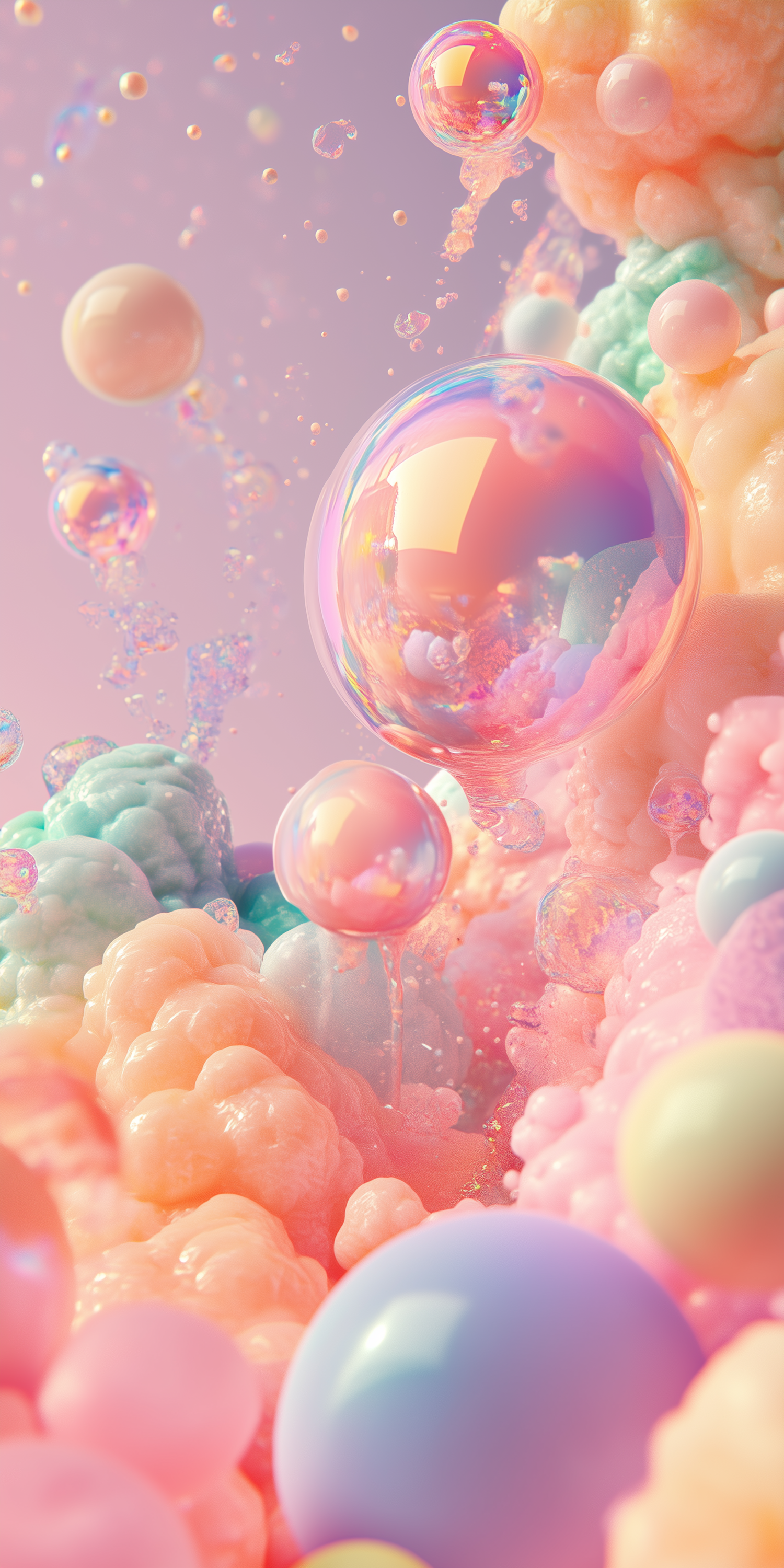 Dreamy pastel bubbles and foam textures in soft pinks, greens, and purples create a whimsical, surreal, and colorful visual delight.