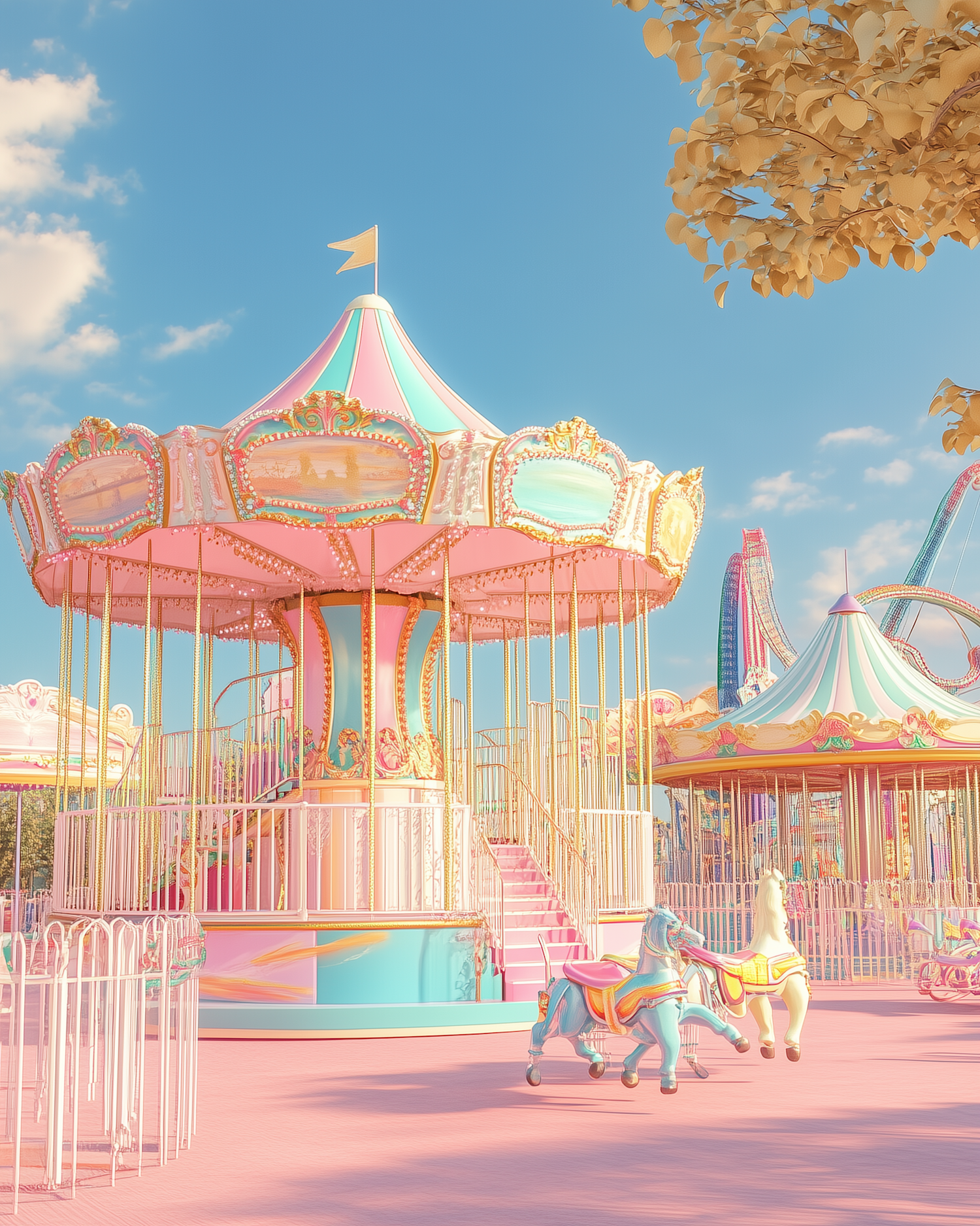 A pastel carousel with ornate details and colorful horses in a sunny amusement park, surrounded by rides and golden-hued trees.