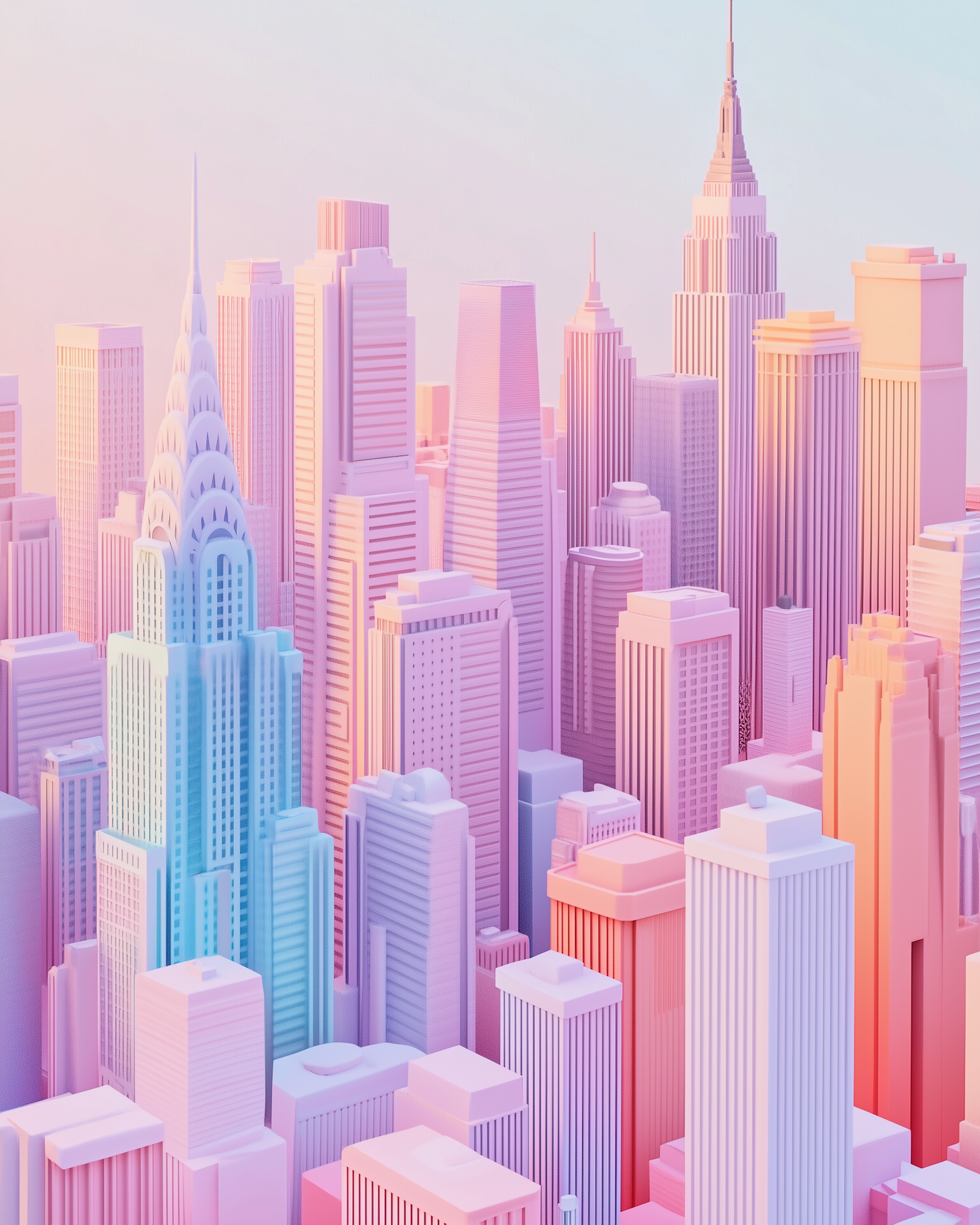 A pastel 3D cityscape with iconic skyscrapers like the Chrysler and Empire State buildings in dreamy pink, blue, and orange hues.