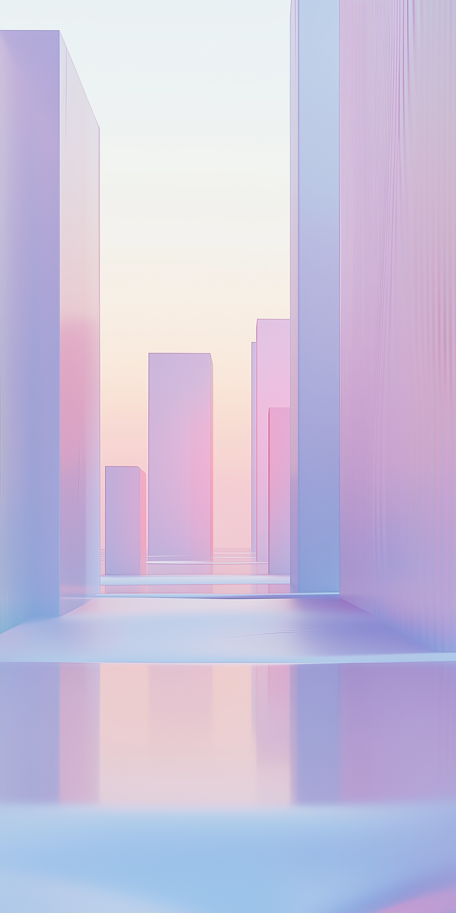 A pastel 3D cityscape with tall, reflective buildings in pink, purple, and blue hues under a gradient sky. Minimalist and futuristic.