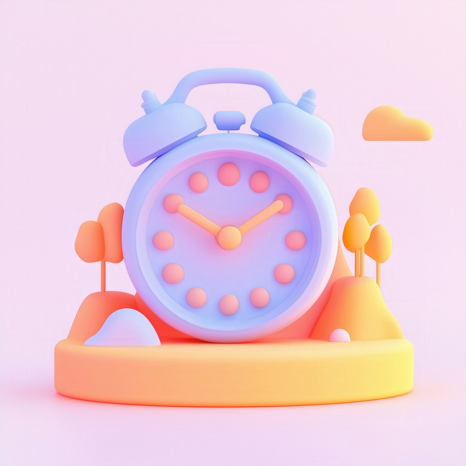Playful 3D illustration of a pastel alarm clock surrounded by stylized trees and clouds, perfect for whimsical or dreamy designs.