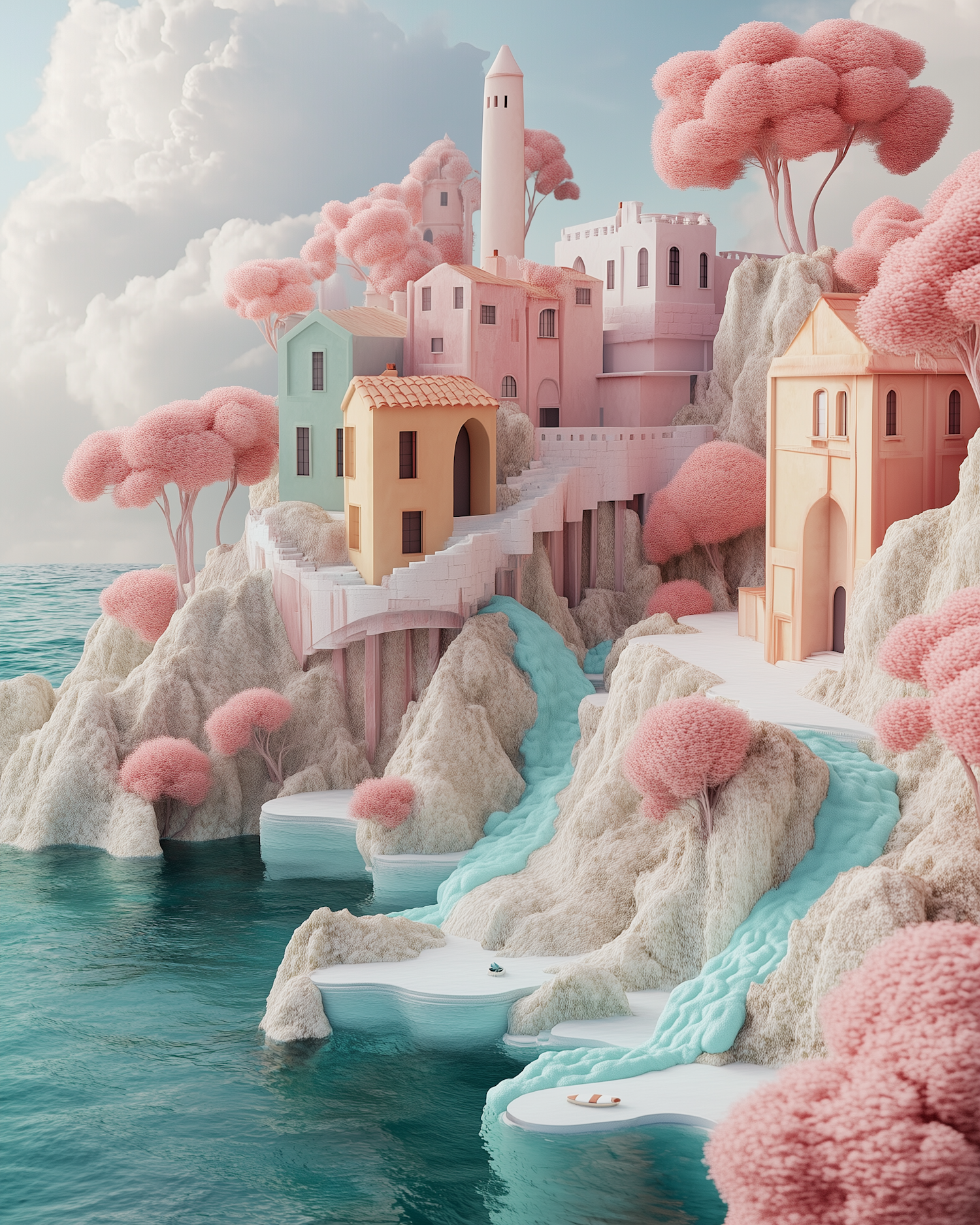 Dreamy pastel coastal village with pink trees, turquoise sea, and cascading waterfall, creating a whimsical and serene atmosphere.