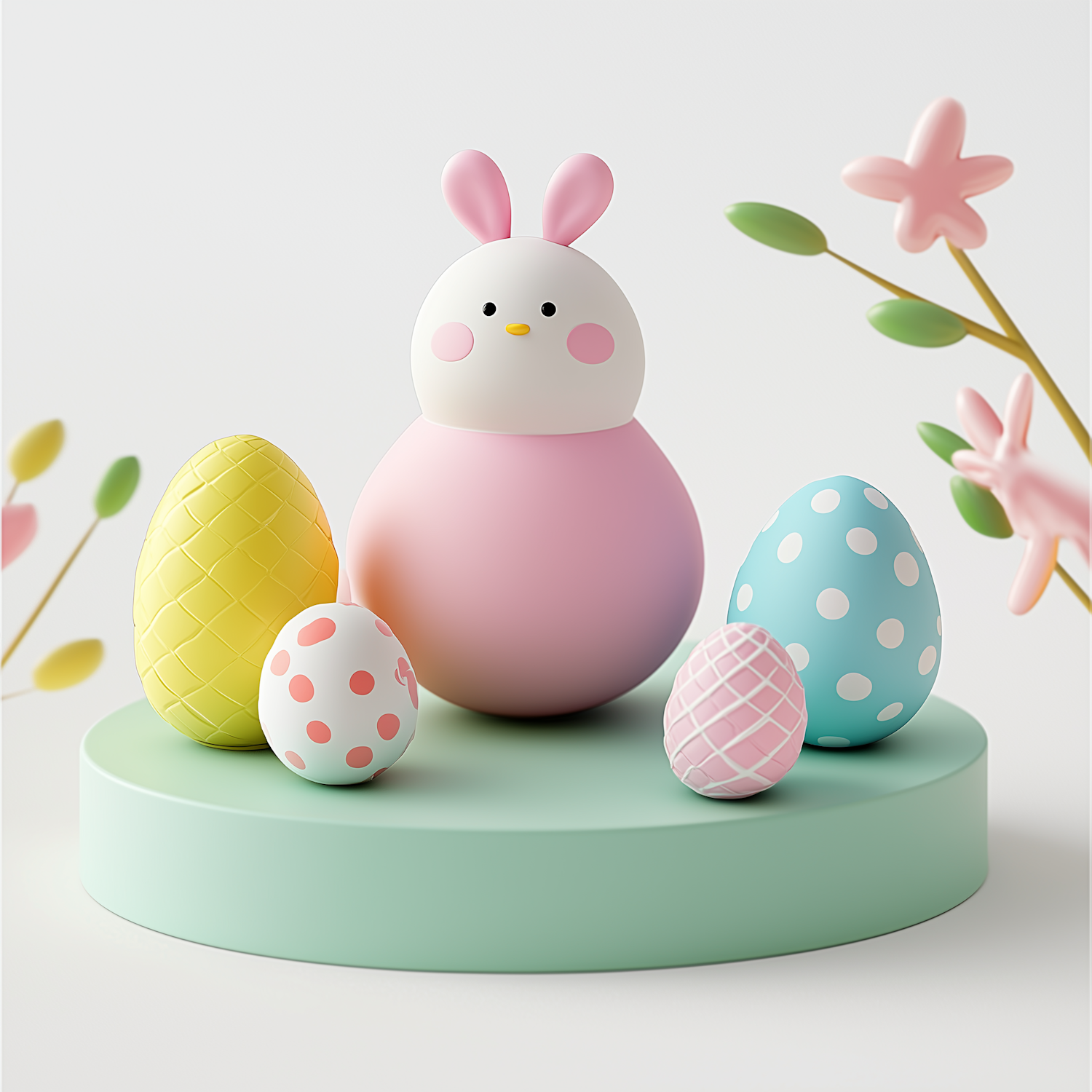 Adorable pastel Easter display with a bunny figure and colorful eggs on a mint-green platform, surrounded by soft floral accents.