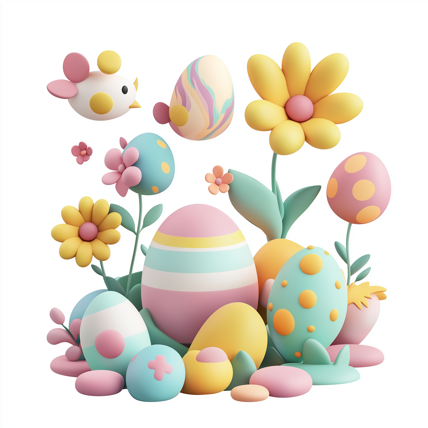 Whimsical pastel Easter eggs, flowers, and a cute bird in a playful springtime illustration. Perfect for festive and cheerful designs.
