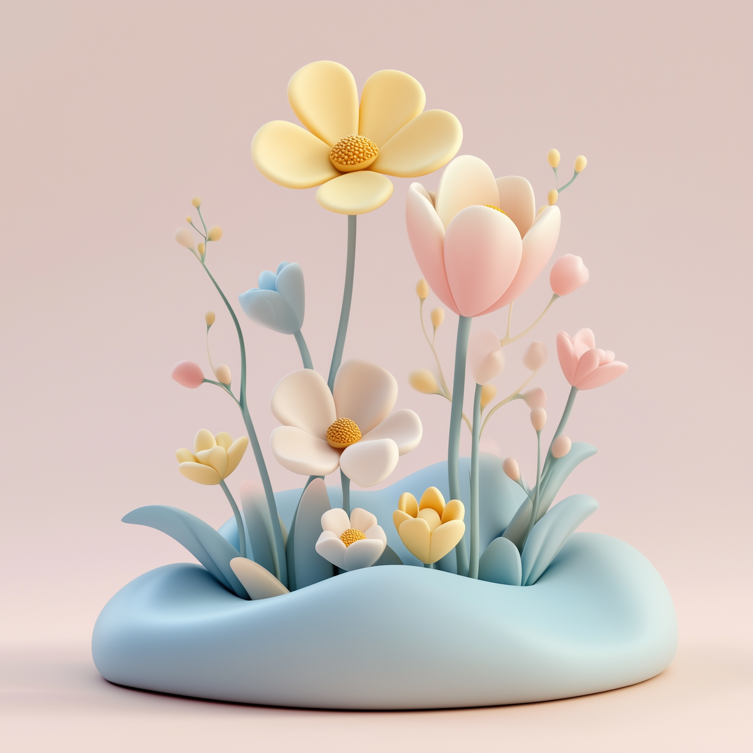 Whimsical 3D floral arrangement with pastel flowers and a smooth blue base, set against a soft beige background. Dreamy and serene design.