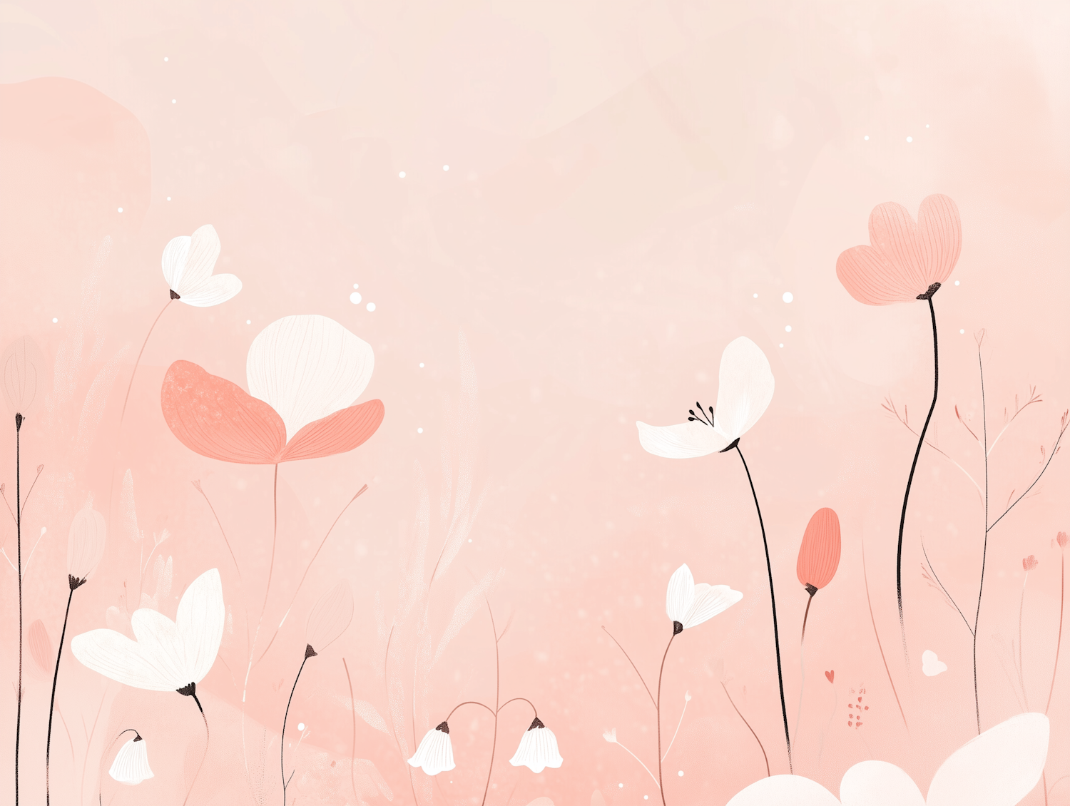 Soft pastel floral illustration with white and coral pink flowers on a pale peach background. Minimalist and dreamy design for serene vibes.