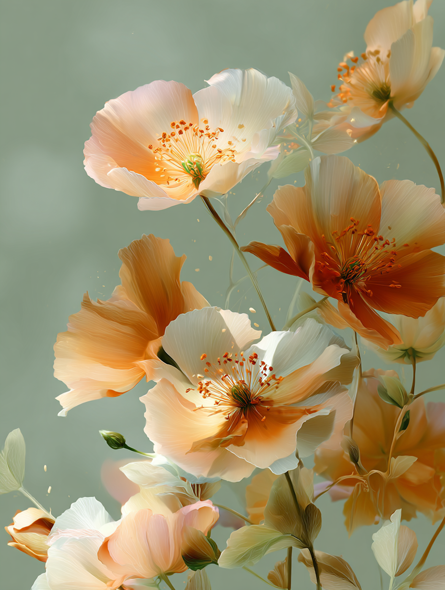 A serene floral illustration with pastel-toned blossoms against a muted green background, highlighting their delicate textures and vibrant hues.
