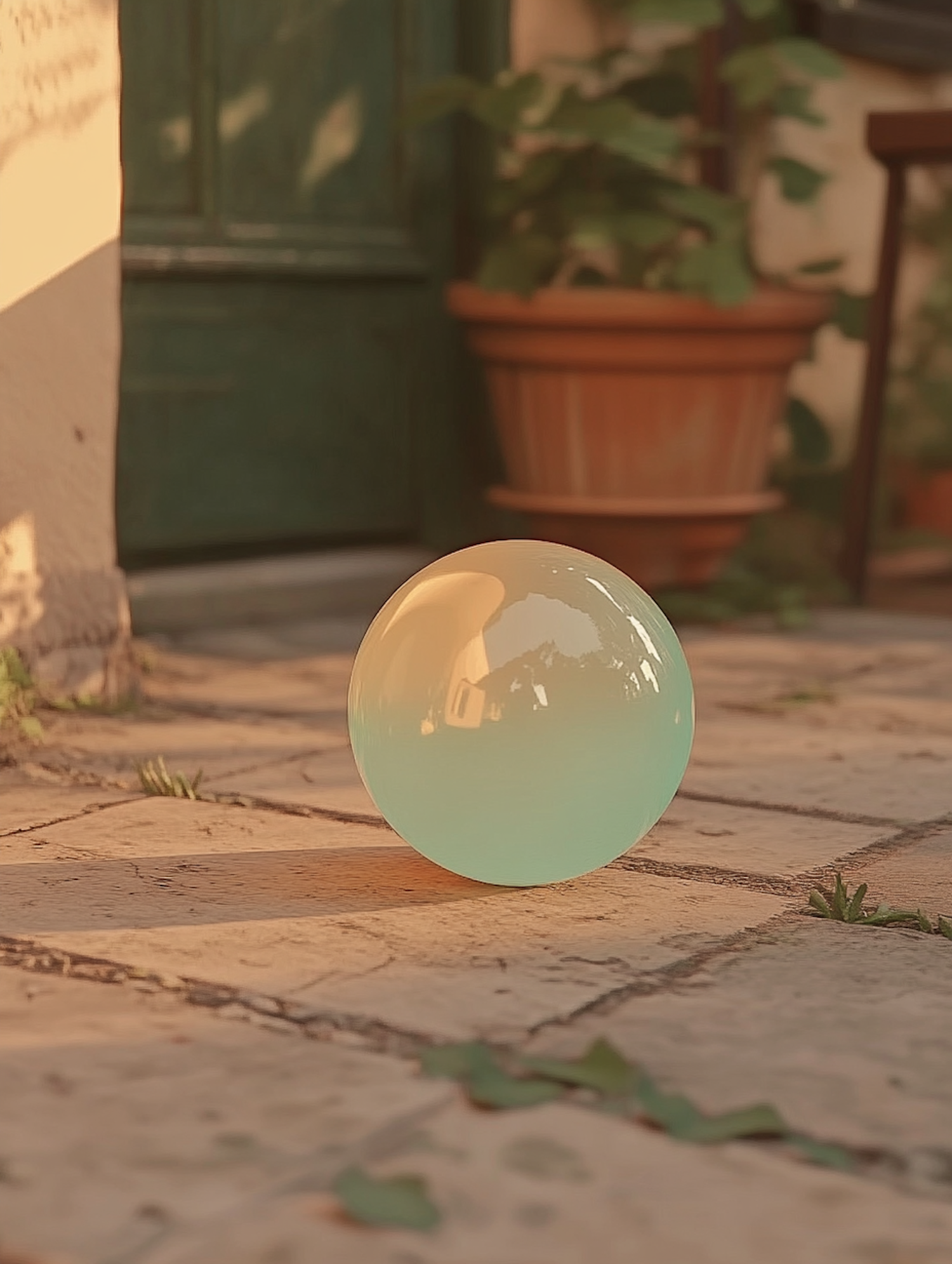 A pastel glass sphere on a sunlit stone patio with greenery and a rustic terracotta pot in the background. Warm, golden tones fill the scene.