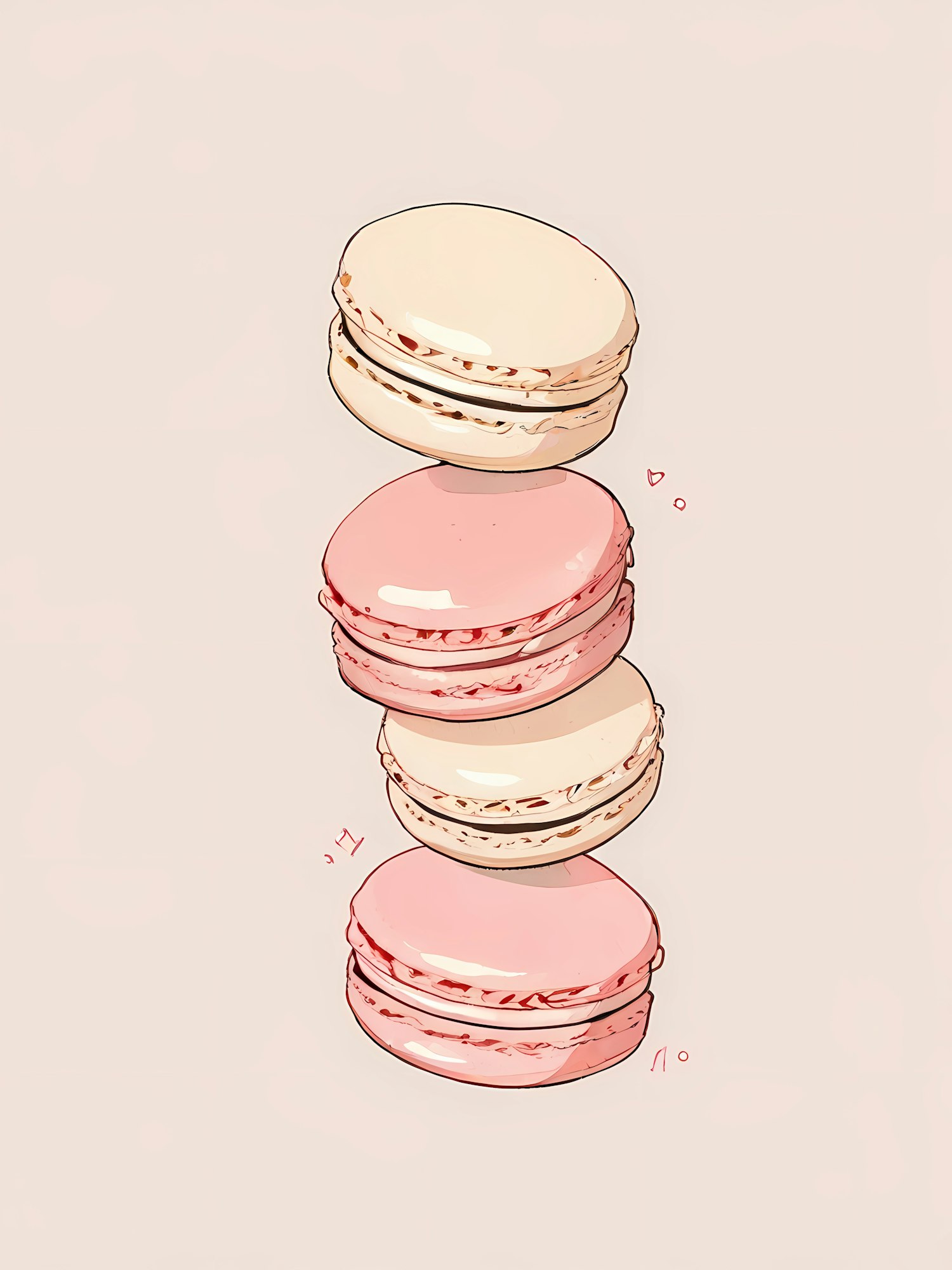 Charming illustration of stacked macarons in cream and pink hues, with playful heart accents on a light beige background.