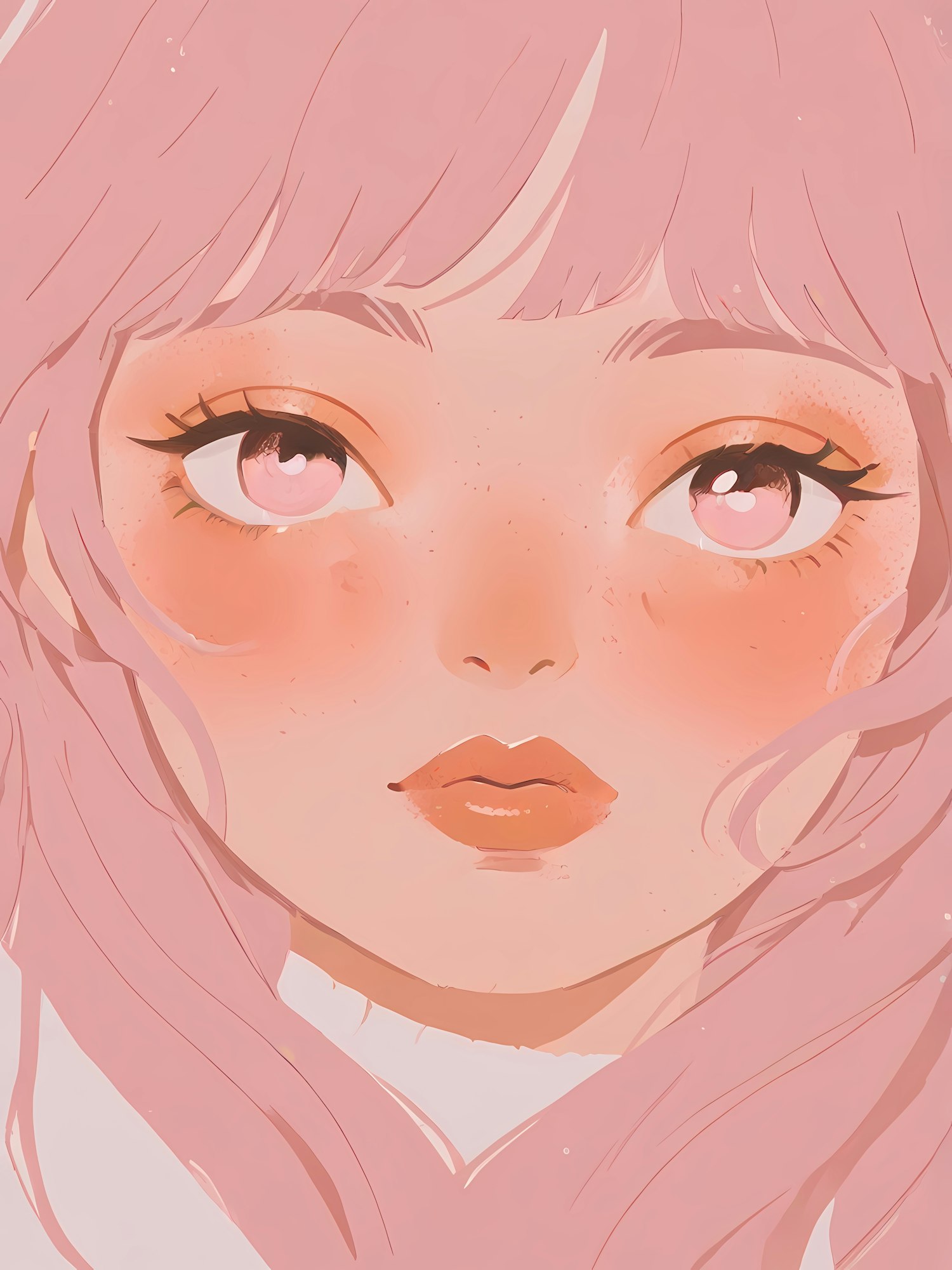 Dreamy illustration of a young woman with pink hair and eyes, featuring a soft pastel color palette and serene expression.