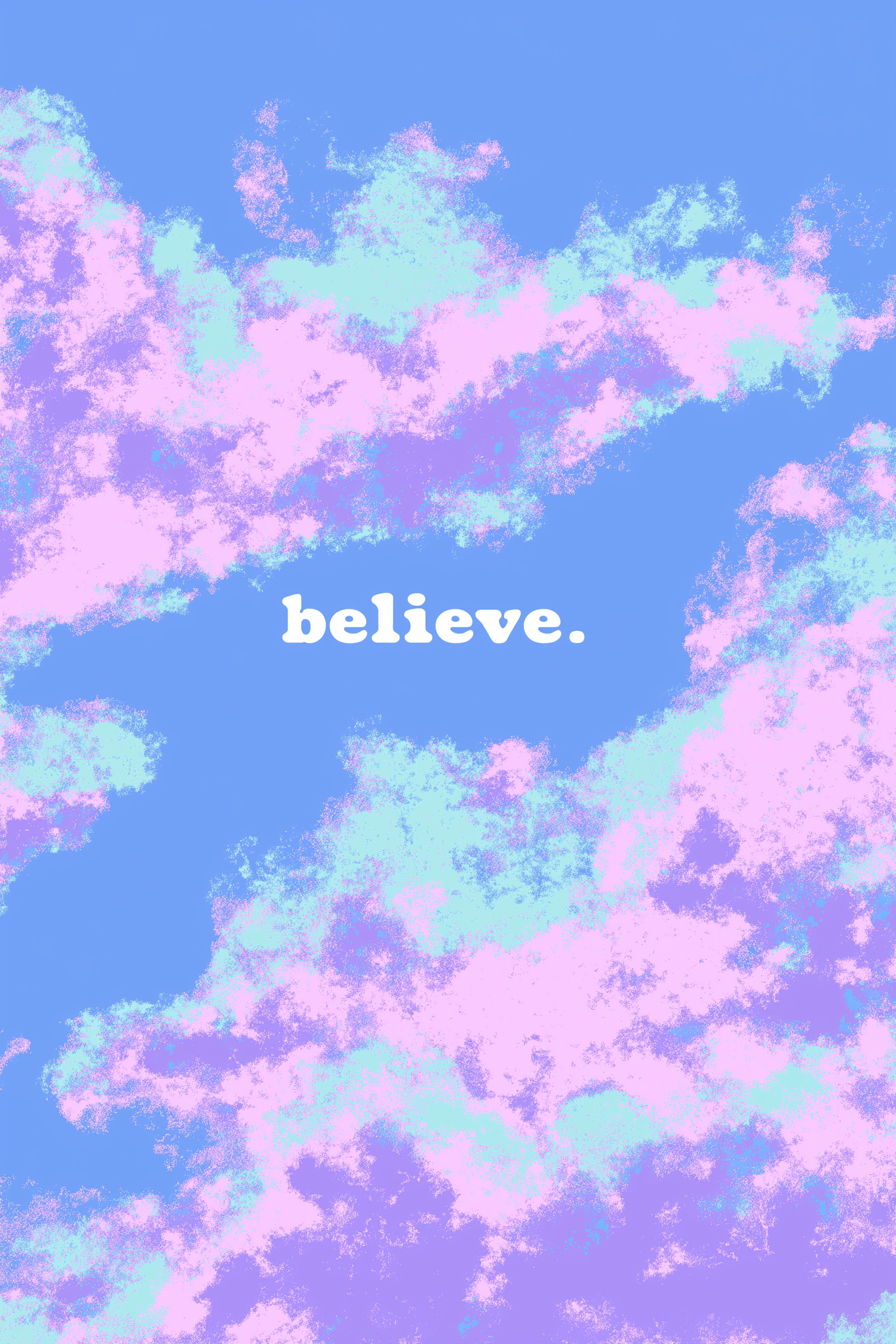 Pastel clouds in pink, purple, and blue with the word 'believe.' in white, creating a dreamy and motivational vibe.