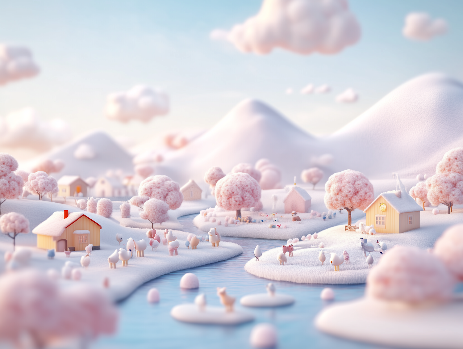 A dreamy pastel winter village with pink trees, cozy houses, and a winding river under a soft blue and peach sky.