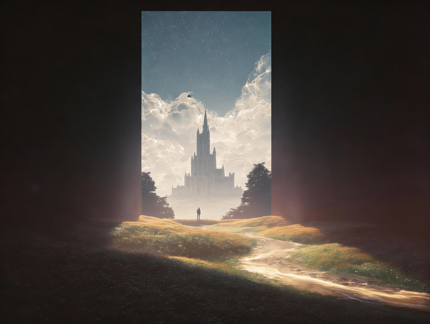 A lone figure stands on a path leading to a majestic castle under a glowing sky, framed by lush fields and a winding stream.