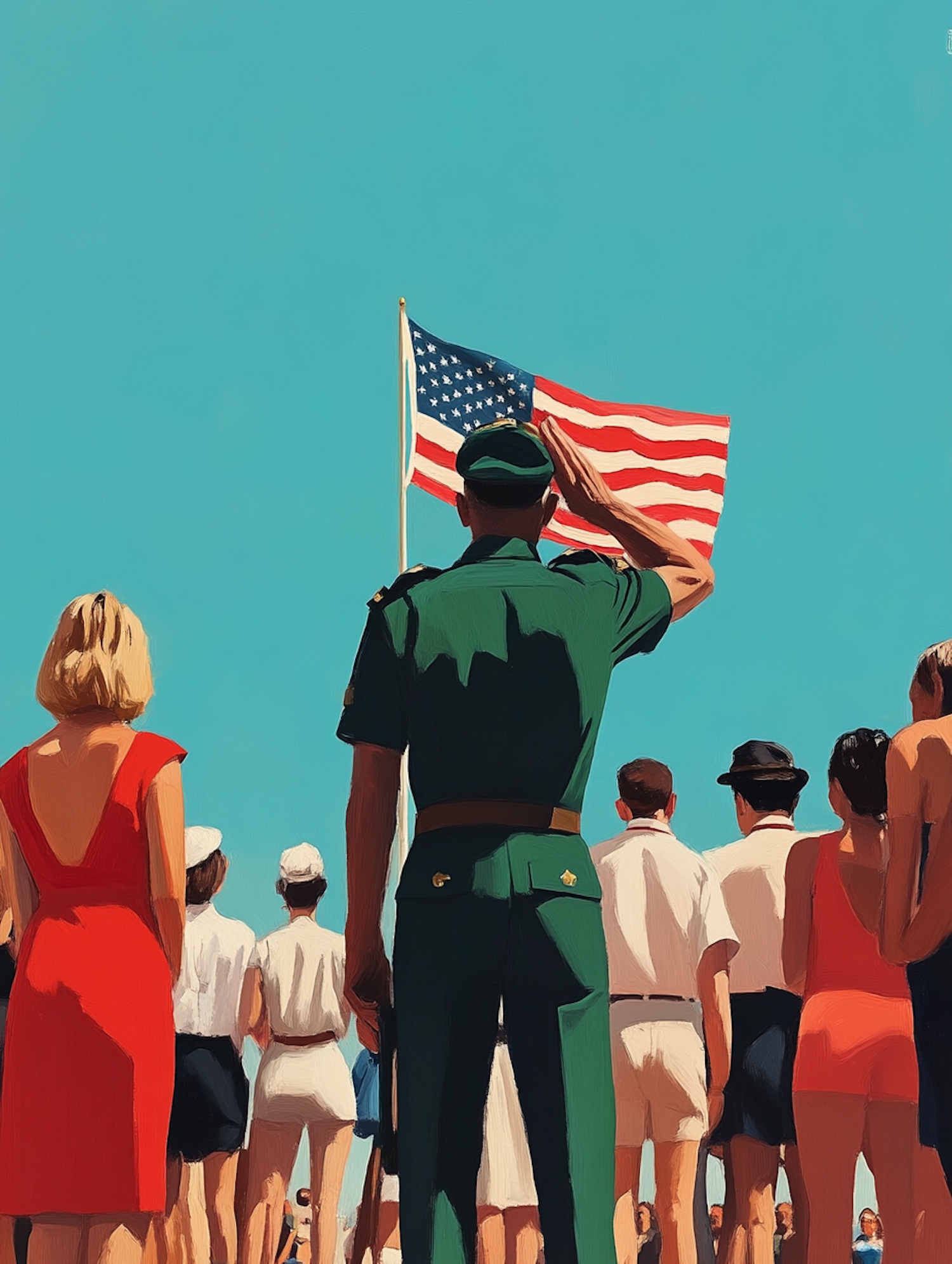 A group of people, including a soldier saluting, face an American flag under a clear blue sky, symbolizing patriotism and unity.