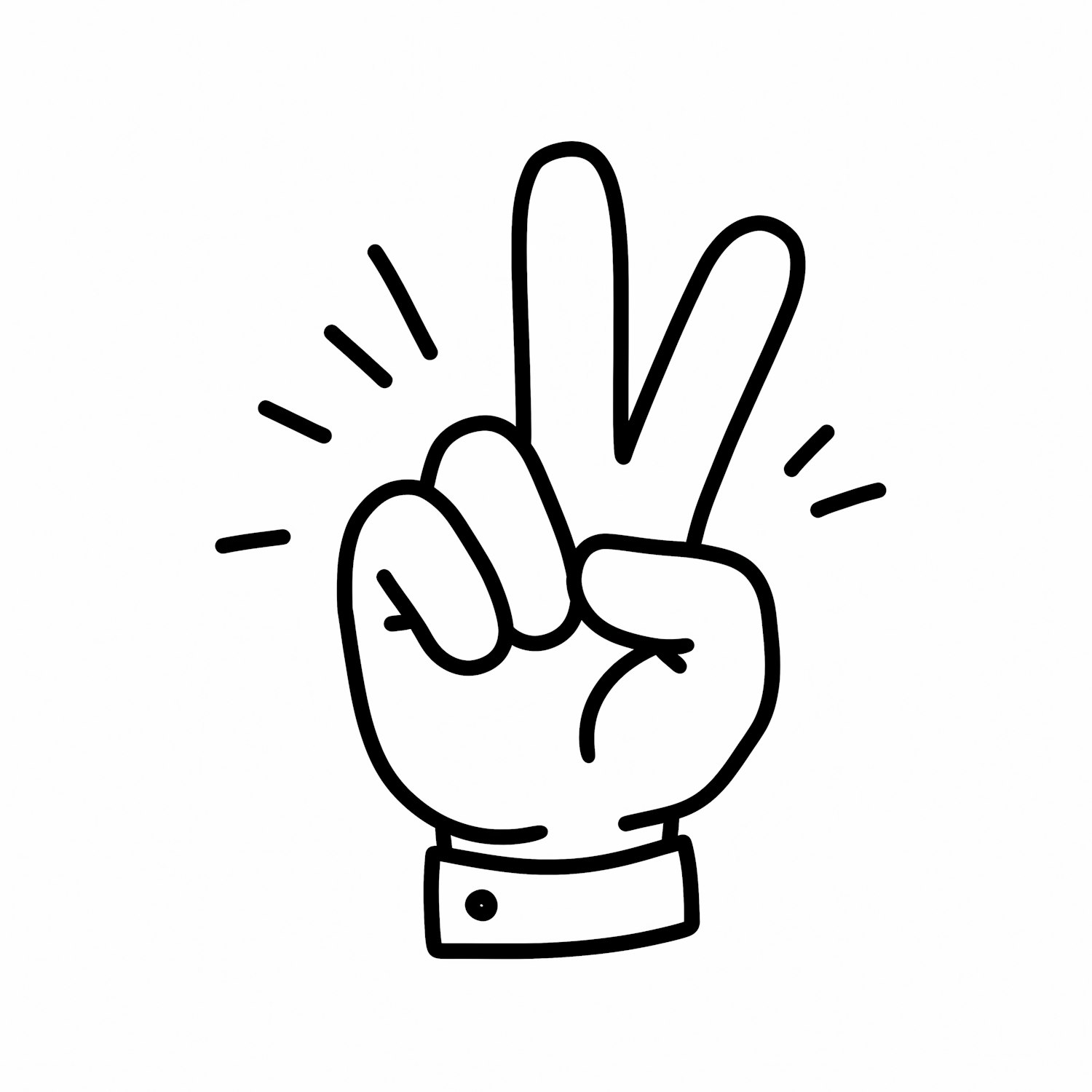Minimalist black-and-white illustration of a hand making a peace sign, with clean lines and a dynamic design.