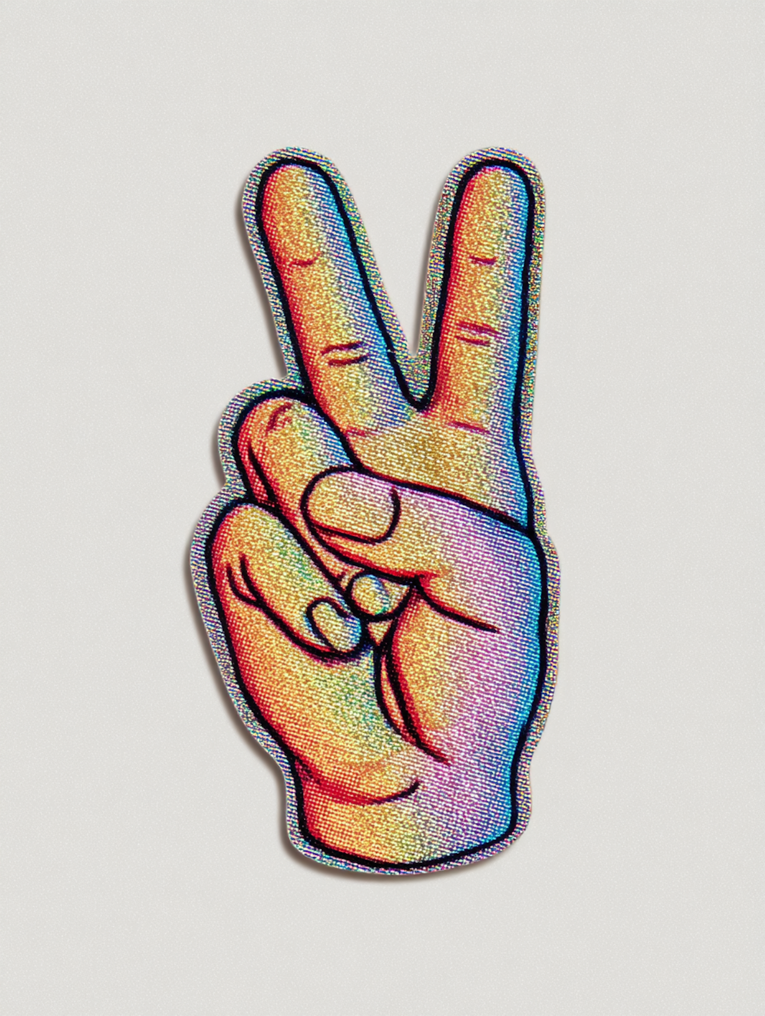 A colorful, textured illustration of a hand making a peace sign, set against a plain background, showcasing a vibrant rainbow gradient.